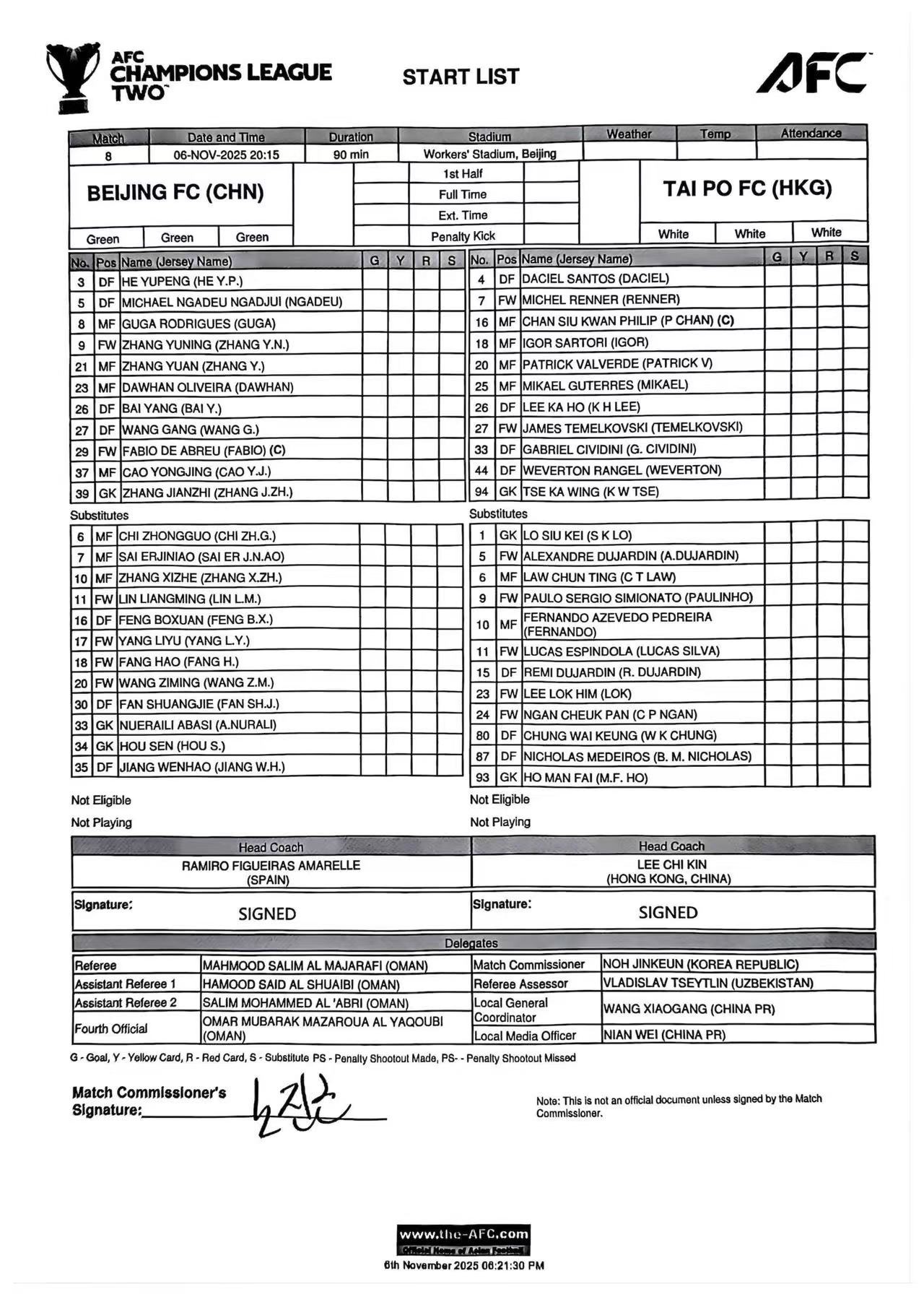 北京时间11月6日20:15,亚冠二级小组赛第4轮,北京国安坐镇主场迎战来自港超的大埔。双方首回合碰面,两队3-3战平。双方赛前公布首发名单。