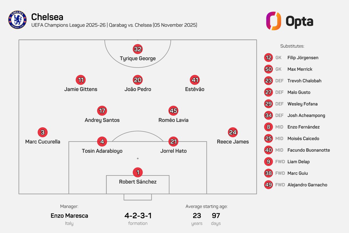 切尔西在本场比赛中排出的首发阵容平均年龄只有23岁97天,这也是英格兰球队在欧冠客场比赛中平均年龄第二小的首发阵容,仅次于阿森纳在2009年12月对阵奥林匹亚科斯时的首发阵容(21岁215天)。