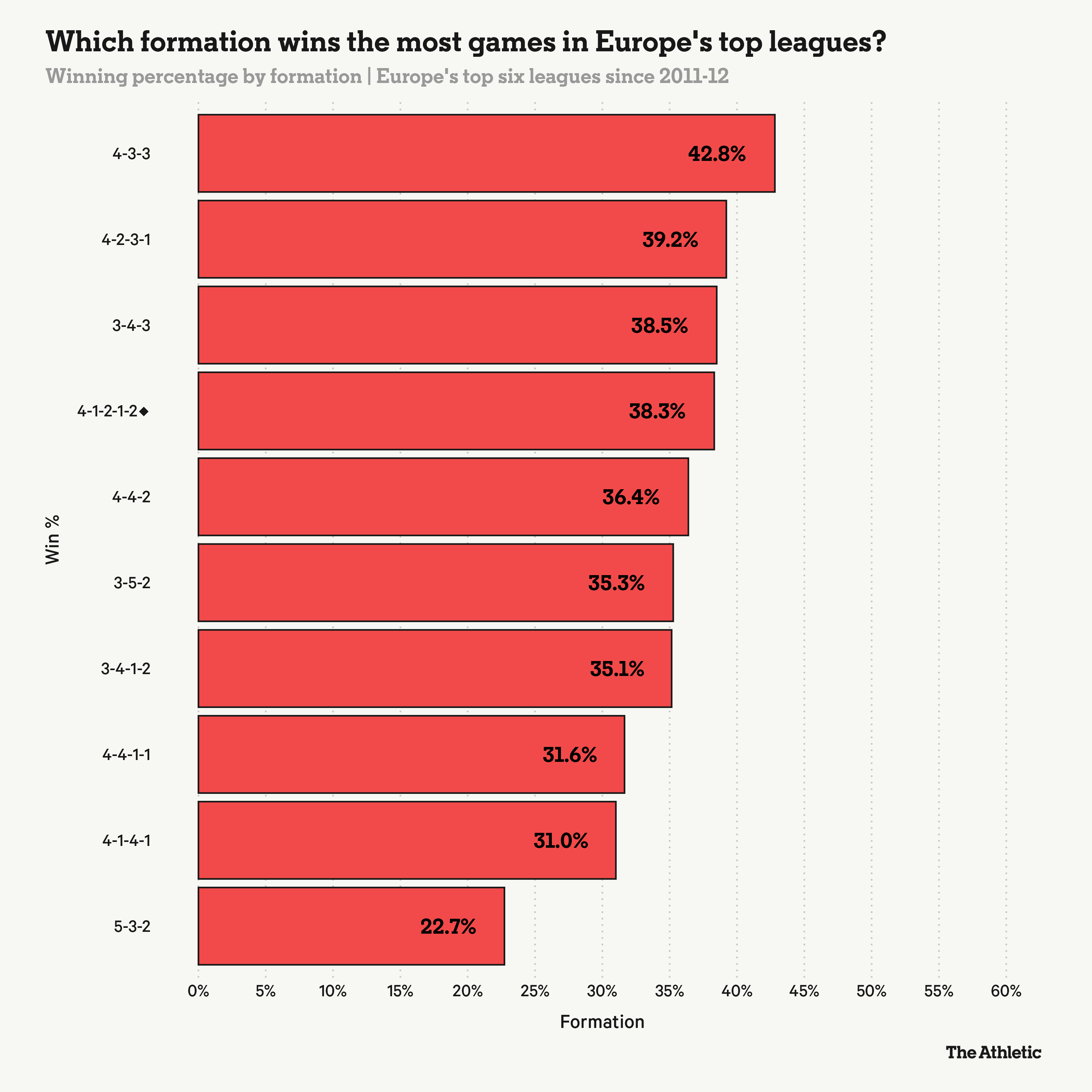 克鲁伊夫始终坚持4-3-3的首要地位。“只要选择了适合系统的正确球员,任何有胆量以正确方式使用4-3-3的人都最终会得到回报,”他在《我的转身》中写道。从表面上看,4-3-3似乎是足球最成功的公式:自2011-12赛季以来,使用它的球队赢得了42.8%的比赛——这是十大常见阵型中最高的胜率。