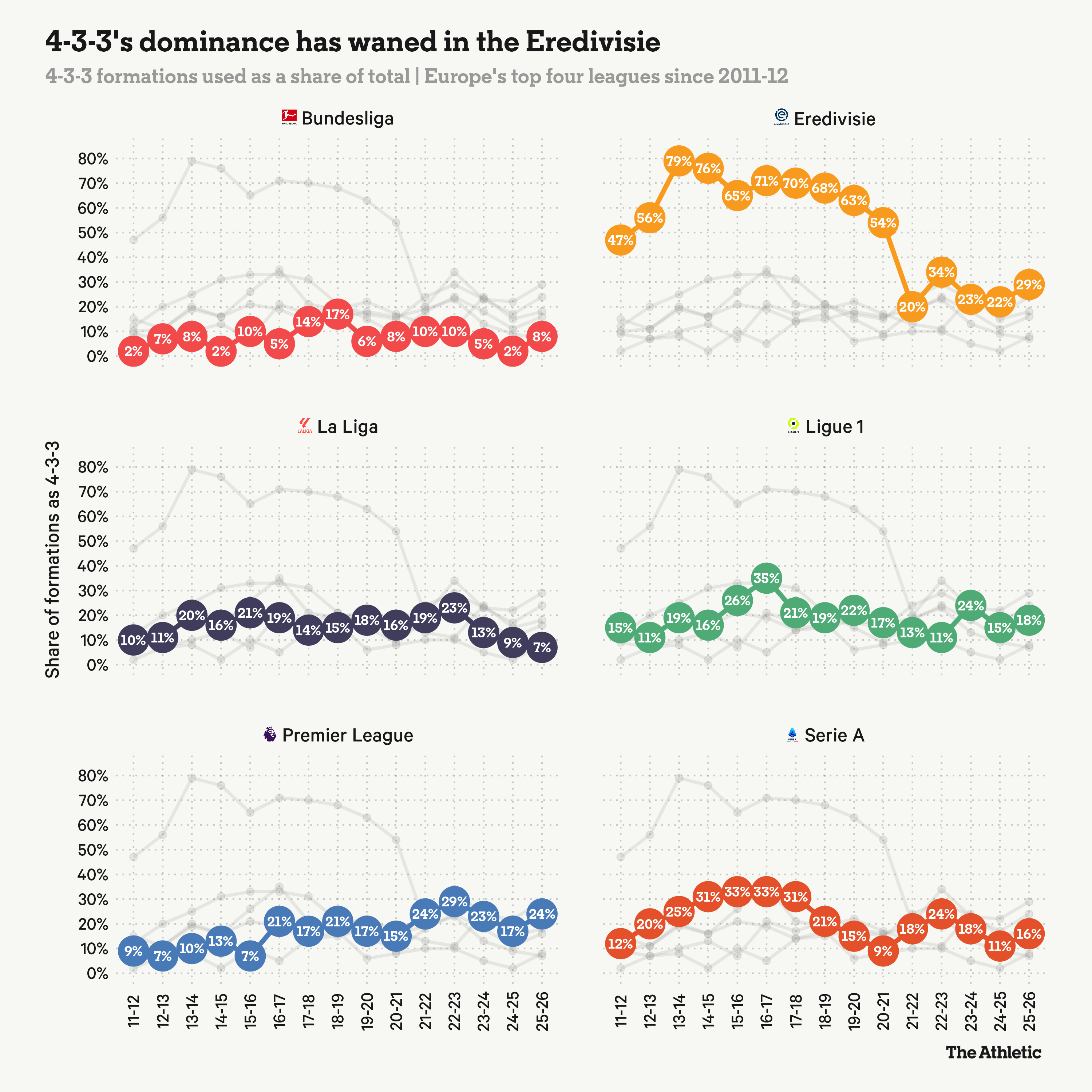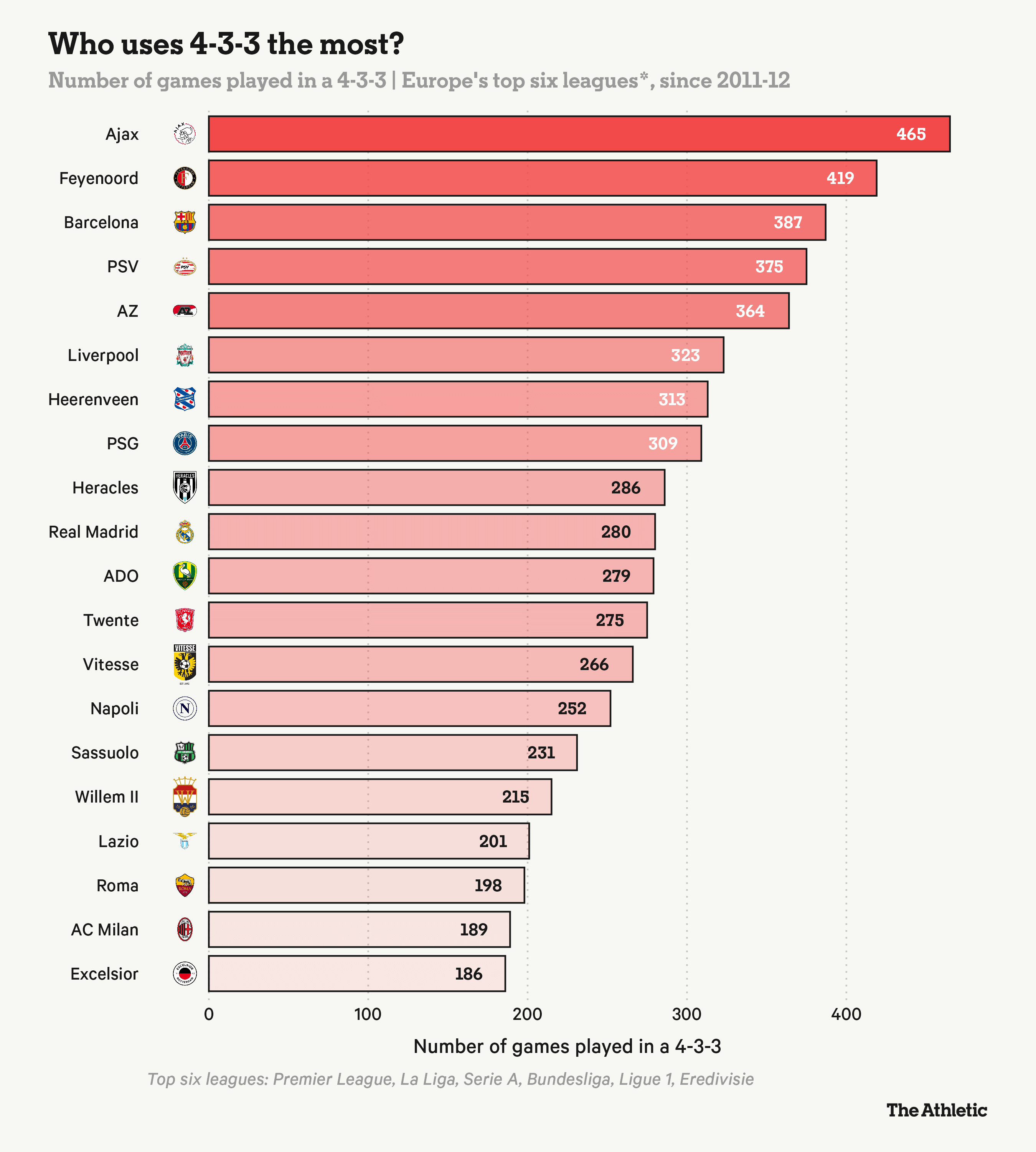 自2010年代以来,逐场比赛的阵型数据开始存在,但这一相对现代的资源为4-3-3阵型提供了揭示性的视角。以下是自2011-12赛季以来,在英格兰、西班牙、荷兰、意大利、法国和德国顶级联赛中使用4-3-3最频繁的球队,全攻全守足球的持久影响显而易见。前20名球队中有11支来自荷甲,这一数据更加引人注目,因为其中六支球队至少有一个赛季不在顶级联赛,这些赛季的比赛未计入以下总数。