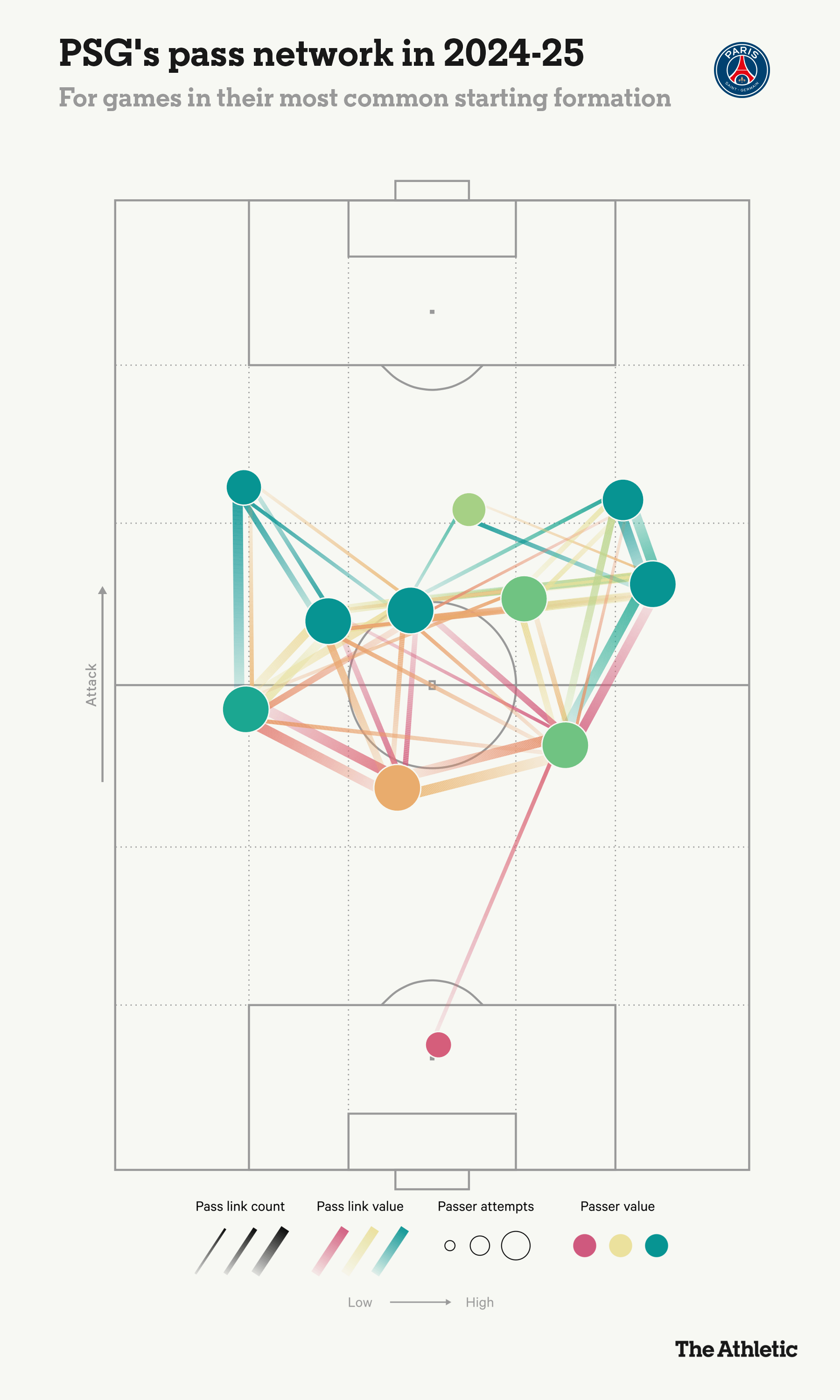但这种成功更多归功于使用它的球队质量——巴塞罗那、利物浦、曼城——而不是阵型本身的内在制胜力量。在这种精神下,大巴黎用4-3-3轻松夺得欧冠荣耀,不过他们上赛季的传球图显示,阵型与传统概念相去甚远,边后卫阿什拉夫常常充当第四名中场。