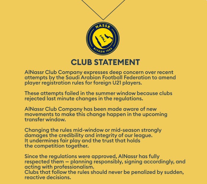 利雅得胜利足球俱乐部对沙特阿拉伯足球协会近期试图修改外籍U21球员注册规则的举动表示深切关注。这些尝试在夏季转会窗口未能成功,因为各俱乐部拒绝了在最后一刻修改规则的做法。