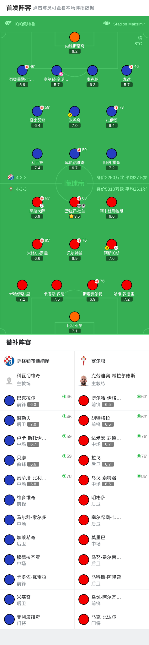 北京时间11月7日欧足联欧洲联赛 联赛阶段 第4轮,萨格勒布迪纳摩对阵塞尔塔。萨格勒布迪纳摩塞尔希-多明格斯自摆乌龙。塞尔塔巴勃罗-杜兰梅开二度。最终比分萨格勒布迪纳摩 03 塞尔塔。