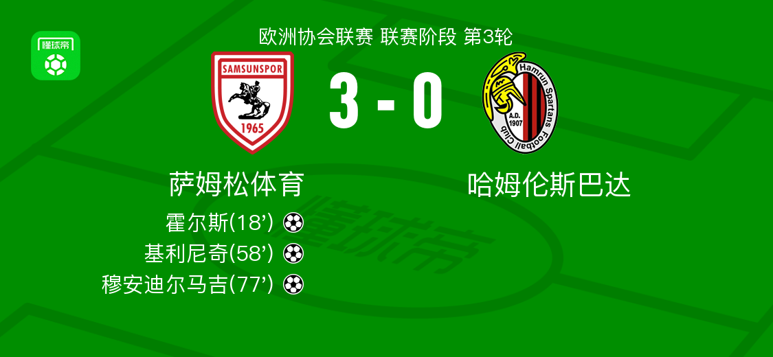 北京时间11月7日,欧洲协会联赛联赛阶段第3轮,萨姆松体育迎战哈姆伦斯巴达。比赛中,基利尼奇送出助攻,帮助霍尔斯率先破门,为球队取得领先。随后,亚夫鲁助攻基利尼奇扩大比分。比赛后段,霍尔斯完成助攻,穆安迪尔马吉接应建功,将比分进一步拉开。最终,萨姆松体育以3-0战胜对手。