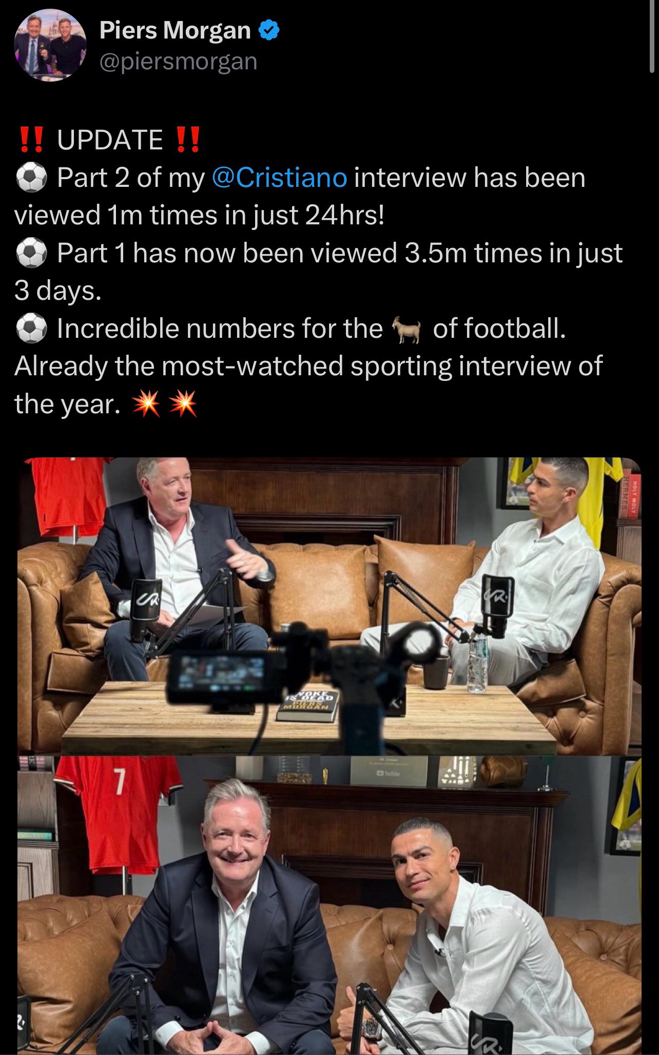 摩根表示:“我与克里斯蒂亚诺采访的第二部分在仅仅24小时内就获得了100万次观看!第一部分在短短3天内已经获得了350万次观看。这对于足球界的🐐来说是令人难以置信的数据,并且已经成为今年观看次数最多的体育采访。💥💥”