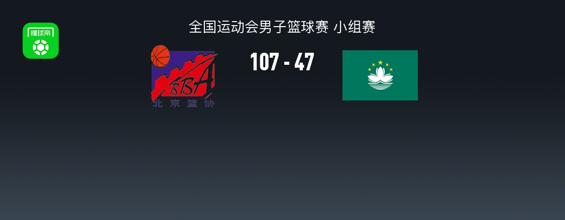 北京时间11月8日全国运动会男子篮球赛 小组赛,北京男篮对阵中国澳门男篮。半场北京男篮65-22中国澳门男篮,最终北京男篮107-47中国澳门男篮。北京男篮张帆19分3板2助,范子铭18分14板6助;中国澳门男篮黎家栋9分7板1助,杨轩9分2板1助。