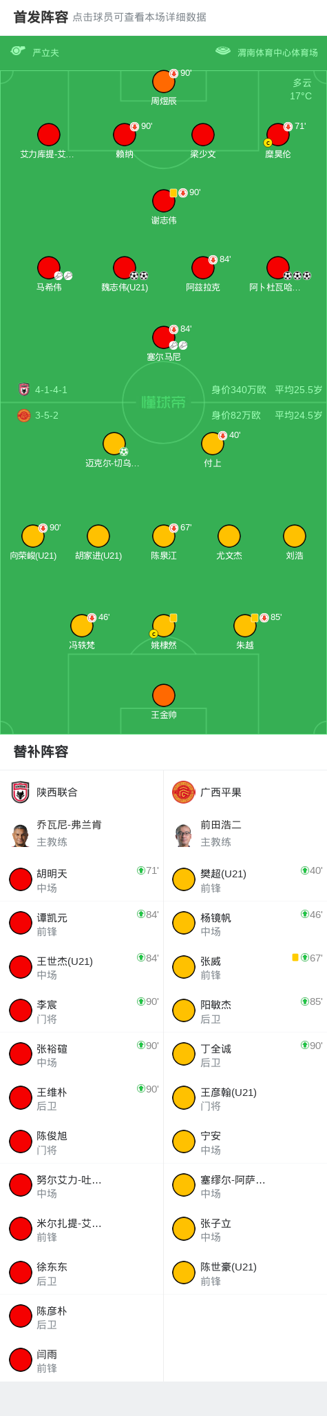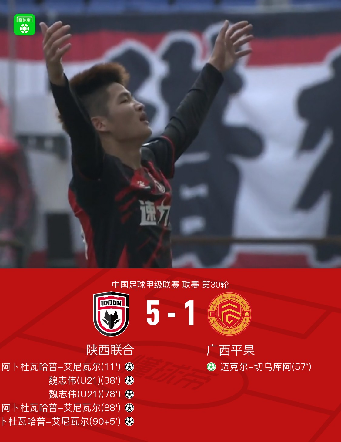 北京时间11月8日中国足球甲级联赛 联赛 第30轮,陕西联合主场对阵广西平果。陕西联合阿卜杜瓦哈普-艾尼瓦尔帽子戏法,魏志伟梅开二度。广西平果迈克尔-切乌库阿破门。最终比分陕西联合 5–1 广西平果。