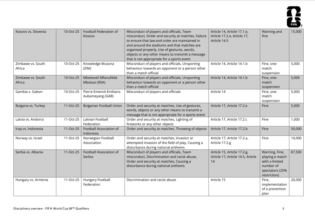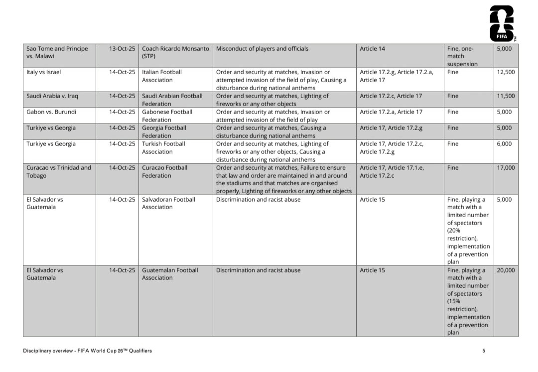 国际足联表示,两家足协面临的指控涉及干扰国歌演奏、观众闯入球场以及比赛中出现的“秩序与安全”问题。具体内容详见国际足联在周四晚间发布的关于世界杯预选赛期间处罚案例的文件。