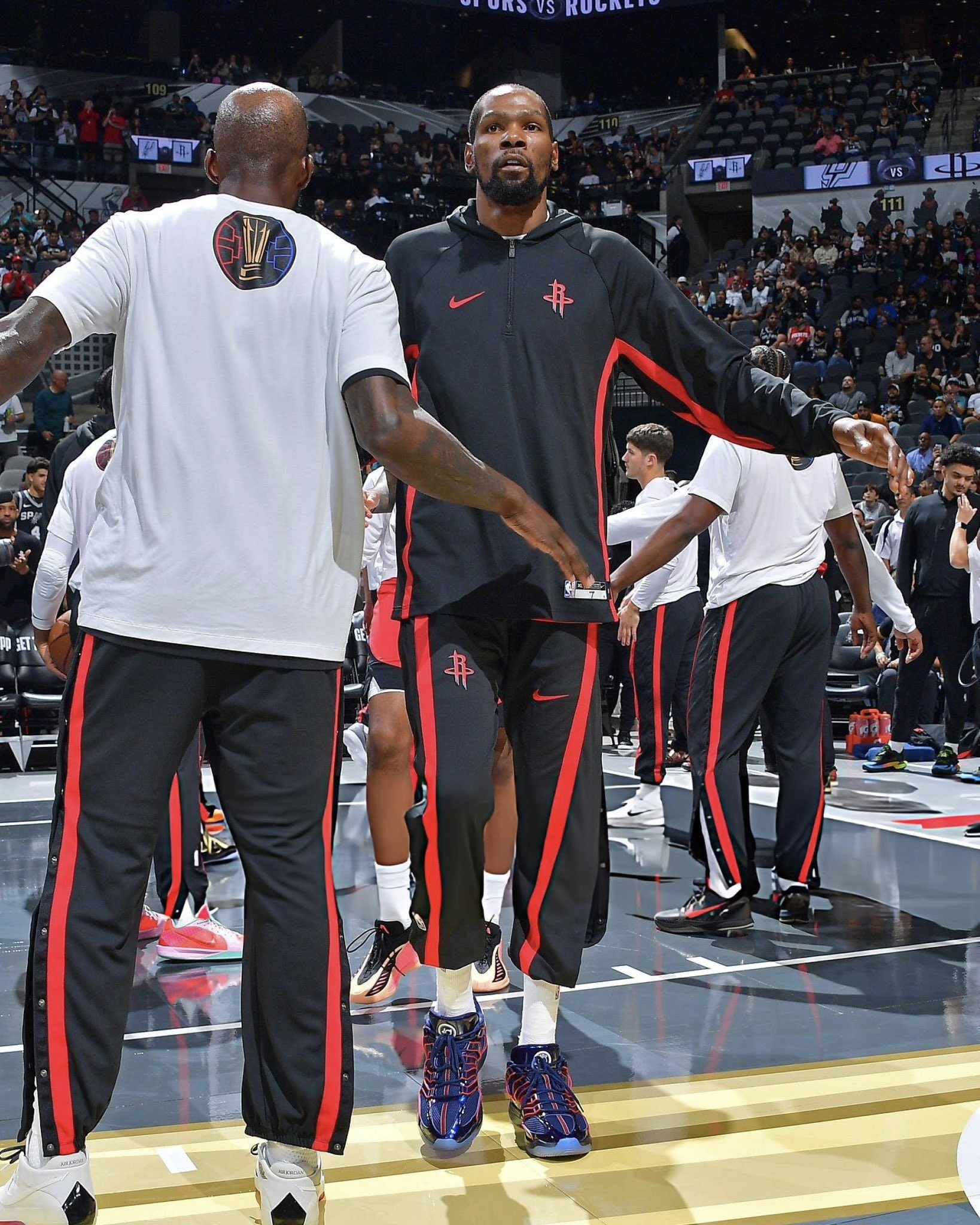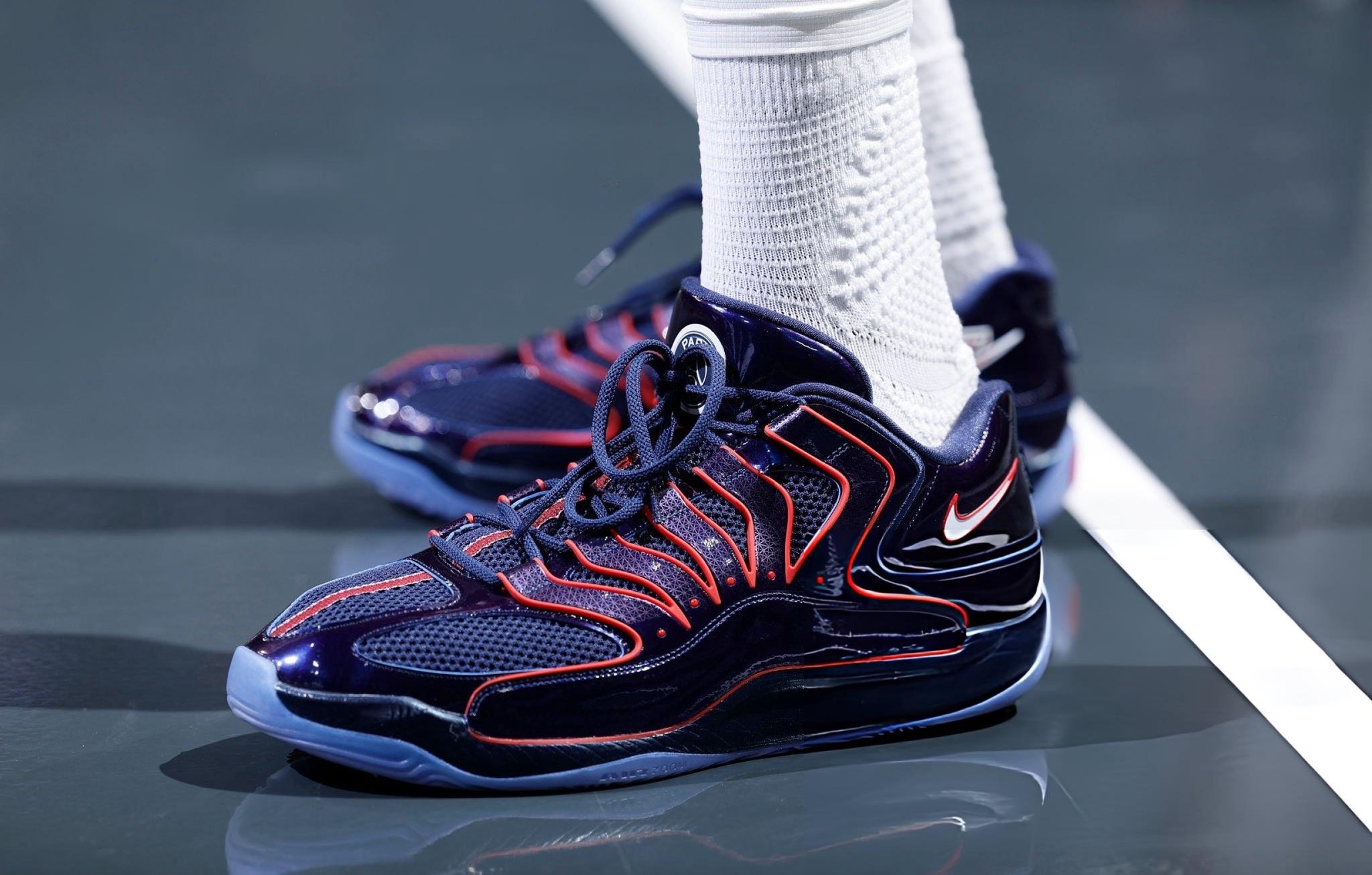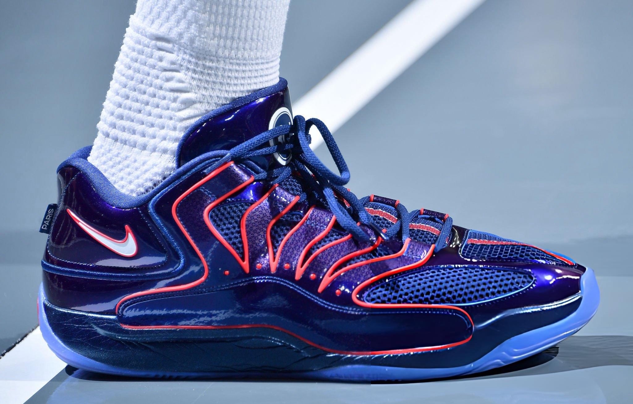 本场比赛,火箭队球星杜兰特首次上脚耐克KD 18 PE巴黎圣日耳曼联名款球鞋出战。通过款式可以看到,这款球鞋属于中帮鞋,以深蓝色和红色作为主要配色,复刻了巴黎圣日耳曼的球队主要配色。