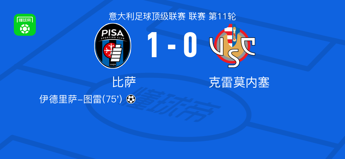北京时间11月8日,意大利足球顶级联赛第11轮,比萨坐镇主场迎战克雷莫内塞。比赛中,特拉莫尼送出助攻,伊德里萨-图雷完成破门,帮助球队取得领先。凭借此次进球,比萨以1-0战胜对手。最终全场比分定格为比萨 1-0 克雷莫内塞。