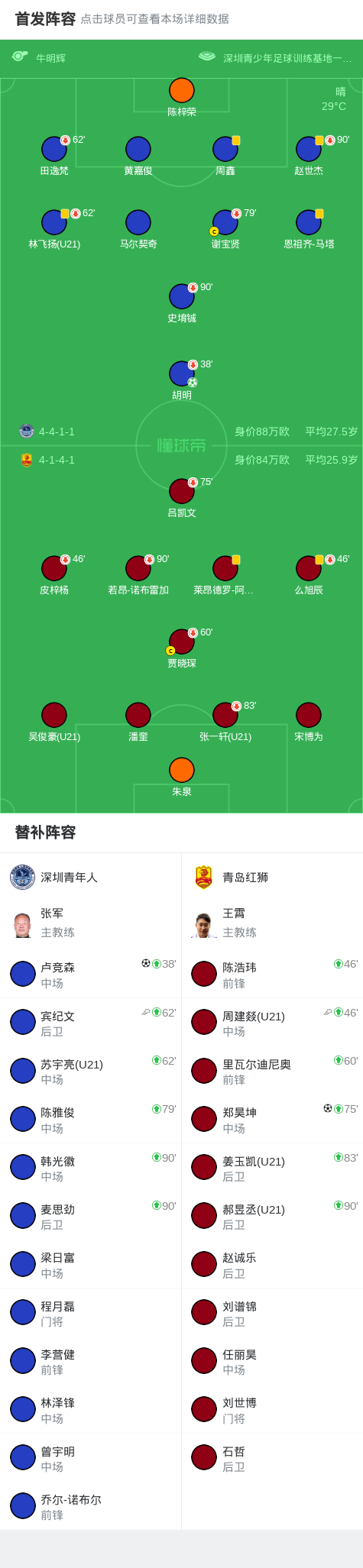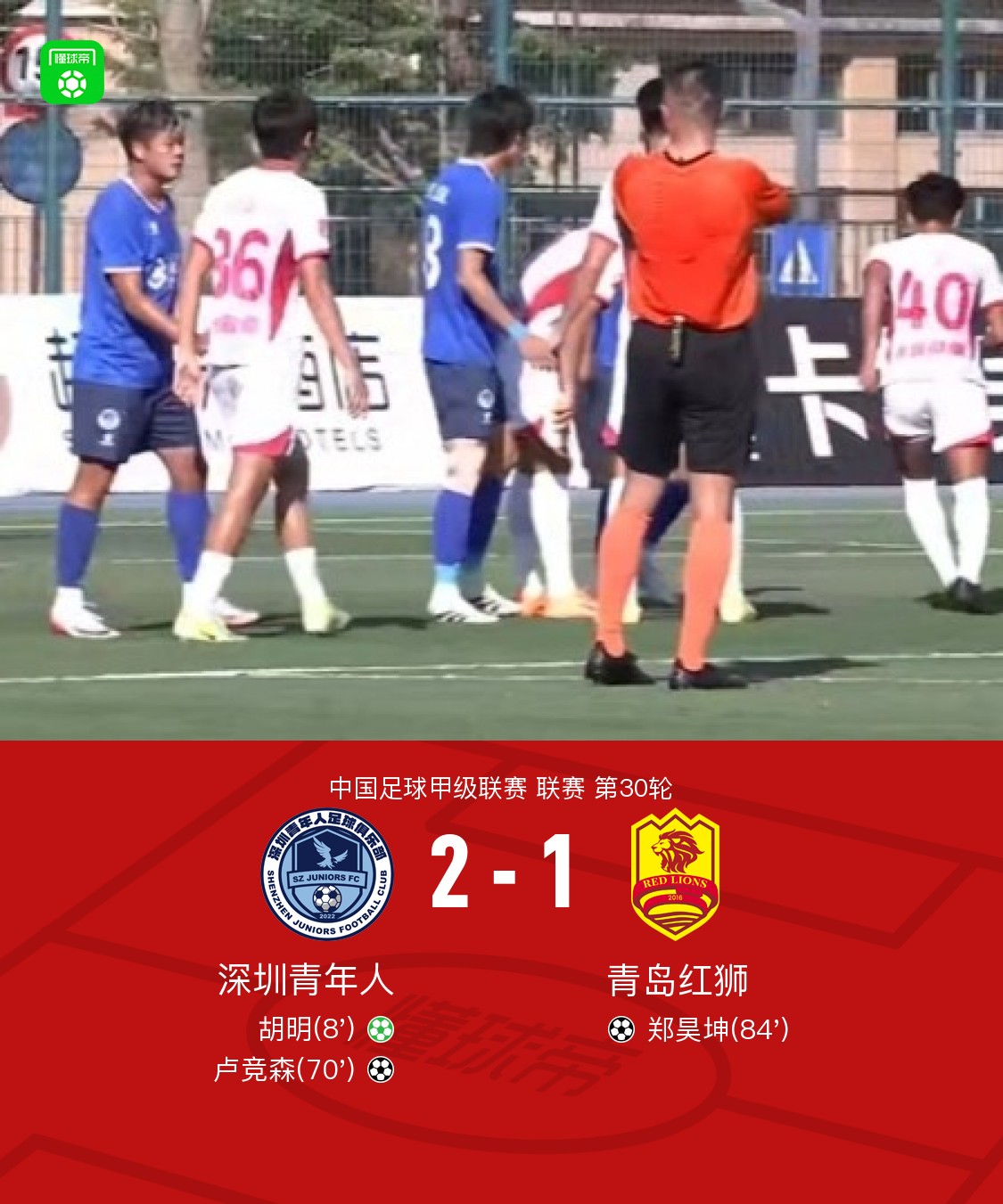 北京时间11月8日中国足球甲级联赛 联赛 第30轮,深圳青年人主场对阵青岛红狮。深圳青年人胡明破门,卢竞森破门。青岛红狮郑昊坤破门。最终比分深圳青年人 2–1 青岛红狮。