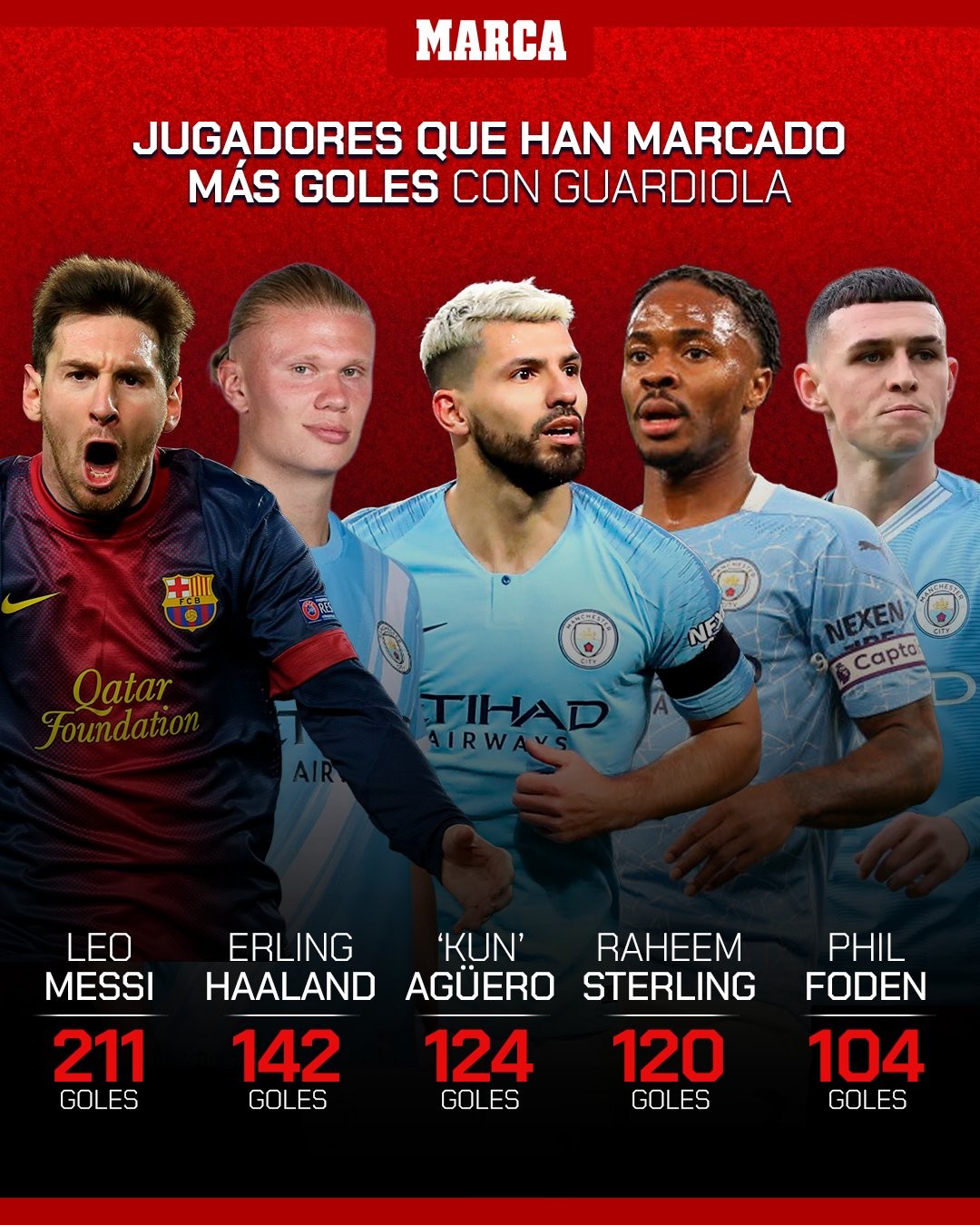 据统计,在瓜迪奥拉执教生涯前999场比赛里,梅西是他手下进球最多的球员,这名阿根廷球星在219次出场中打进211球。其次是哈兰德,挪威中锋在160次登场中斩获142球。