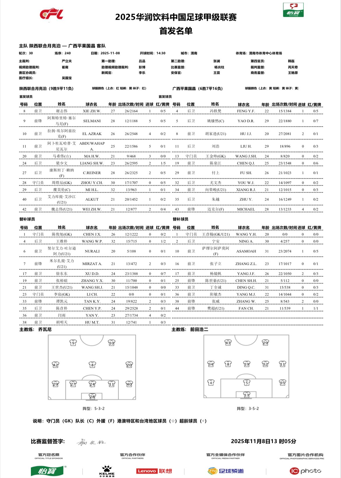 北京时间11月8日14:30,中甲联赛第30轮,陕西联合坐镇主场迎战广西平果,本场比赛主裁判是严立夫,VAR是崔雍,赛前双方公布首发: 文章导航 基翁:阿森纳需要更具狠劲,不能每周都依赖绝杀进球和运气 瓦茨克:巴黎vs拜仁上半场很精彩,很高兴德甲有拜仁这种强队