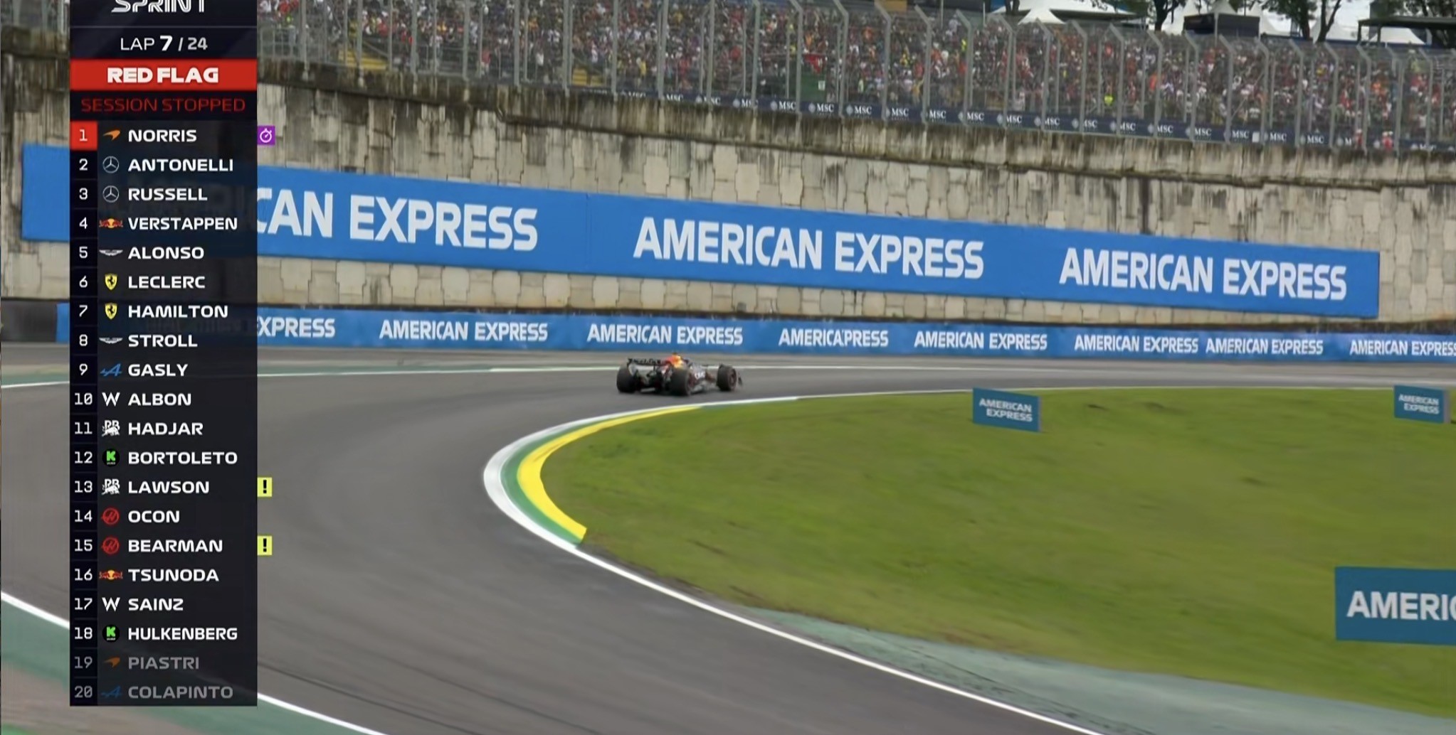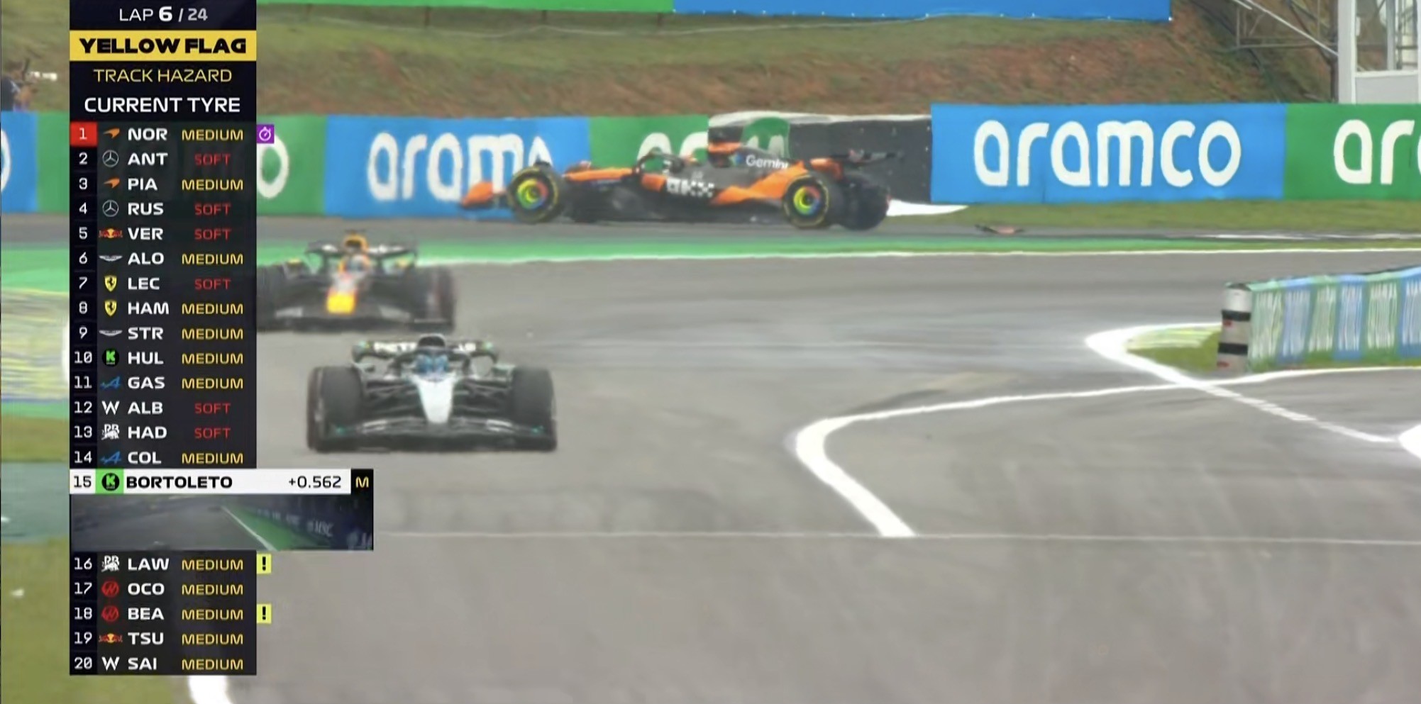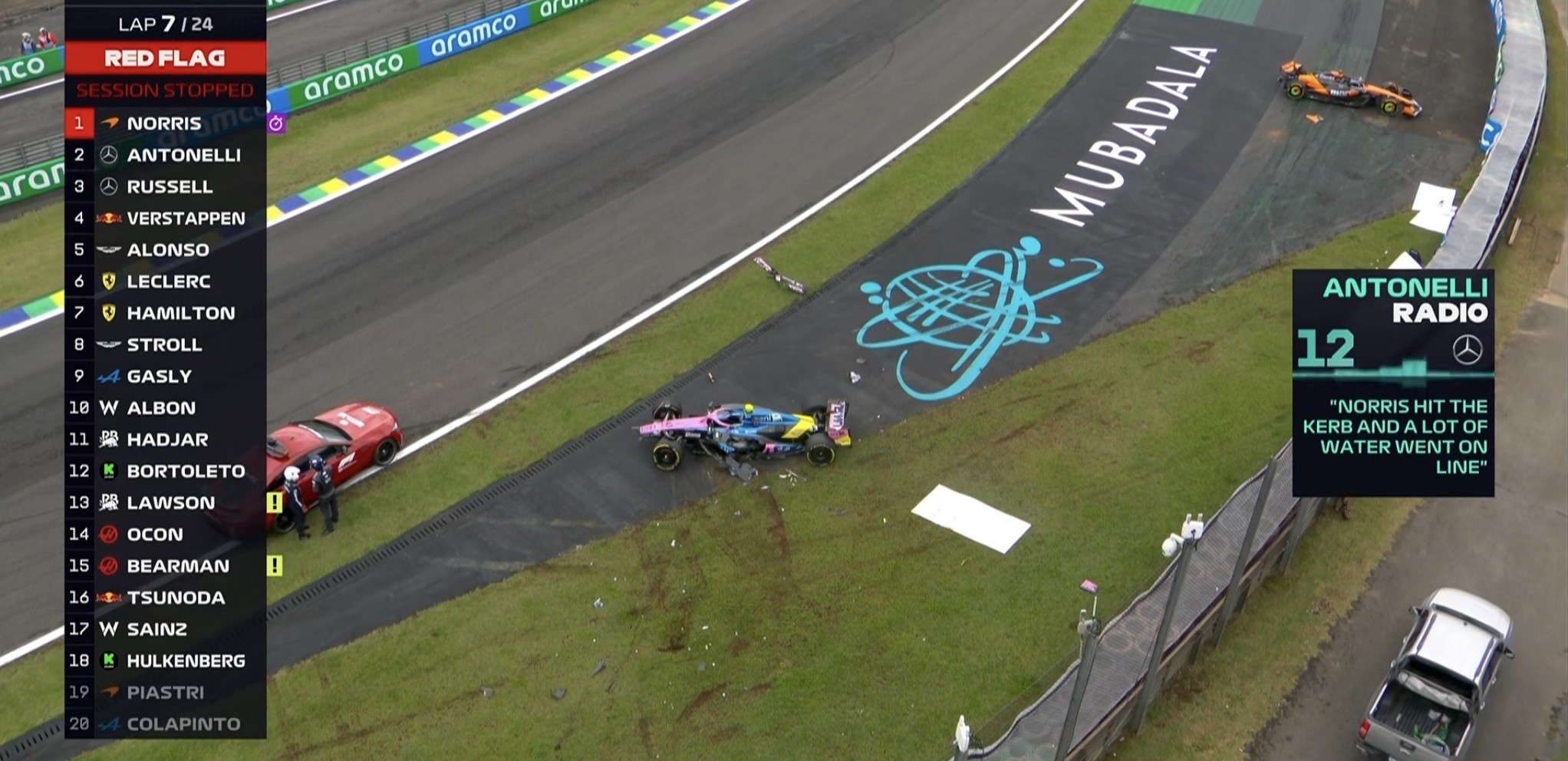 安东内利表示:诺里斯用了更多的路肩,导致很多的积水被带到赛车线上,这也间接导致了三位车手的失控退赛;