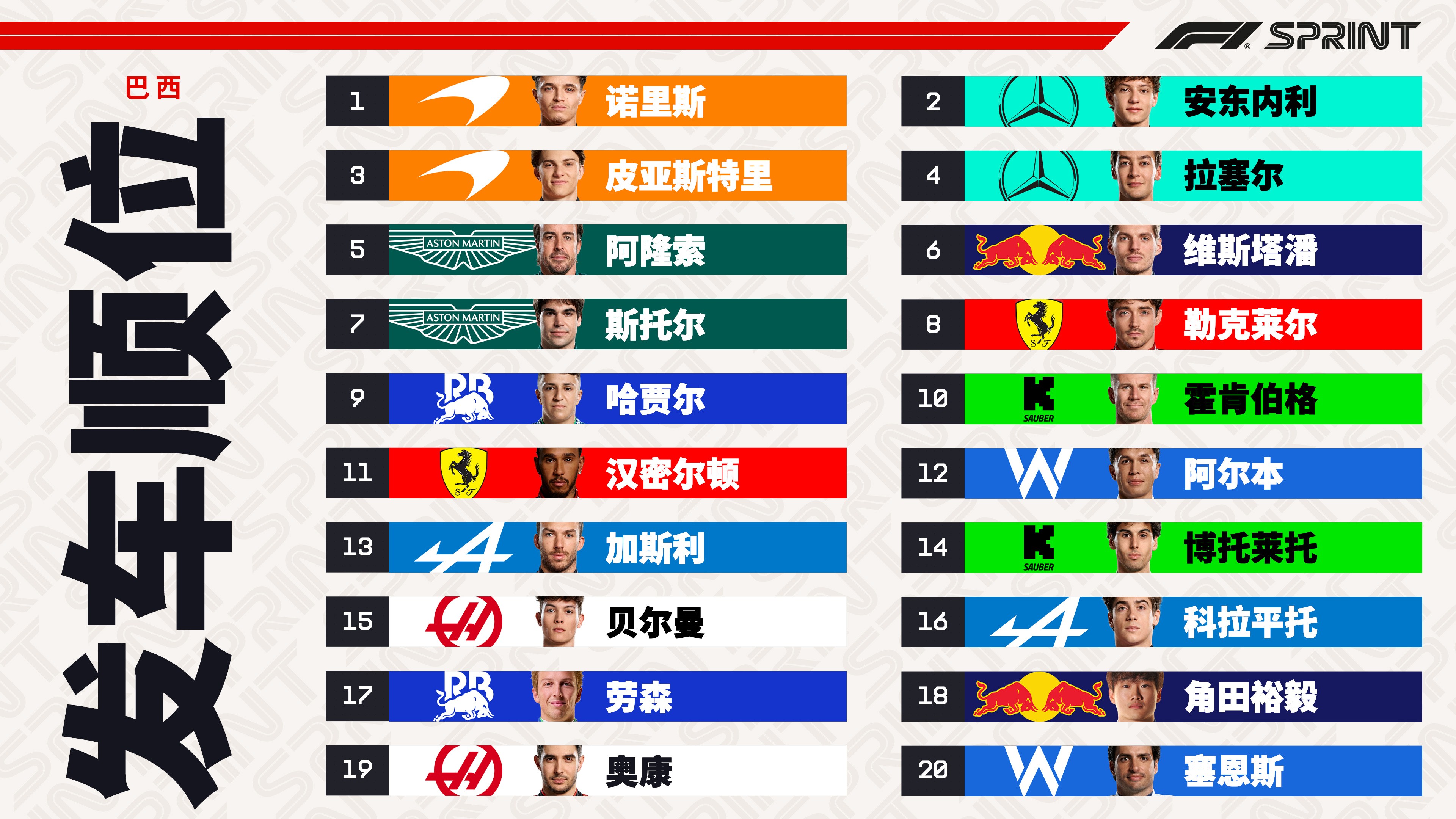 诺里斯,安东内利包揽前排,身后的则是皮亚斯特里、拉塞尔。阿隆索、维斯塔潘处在第三排,角田、塞恩斯维修区起步。