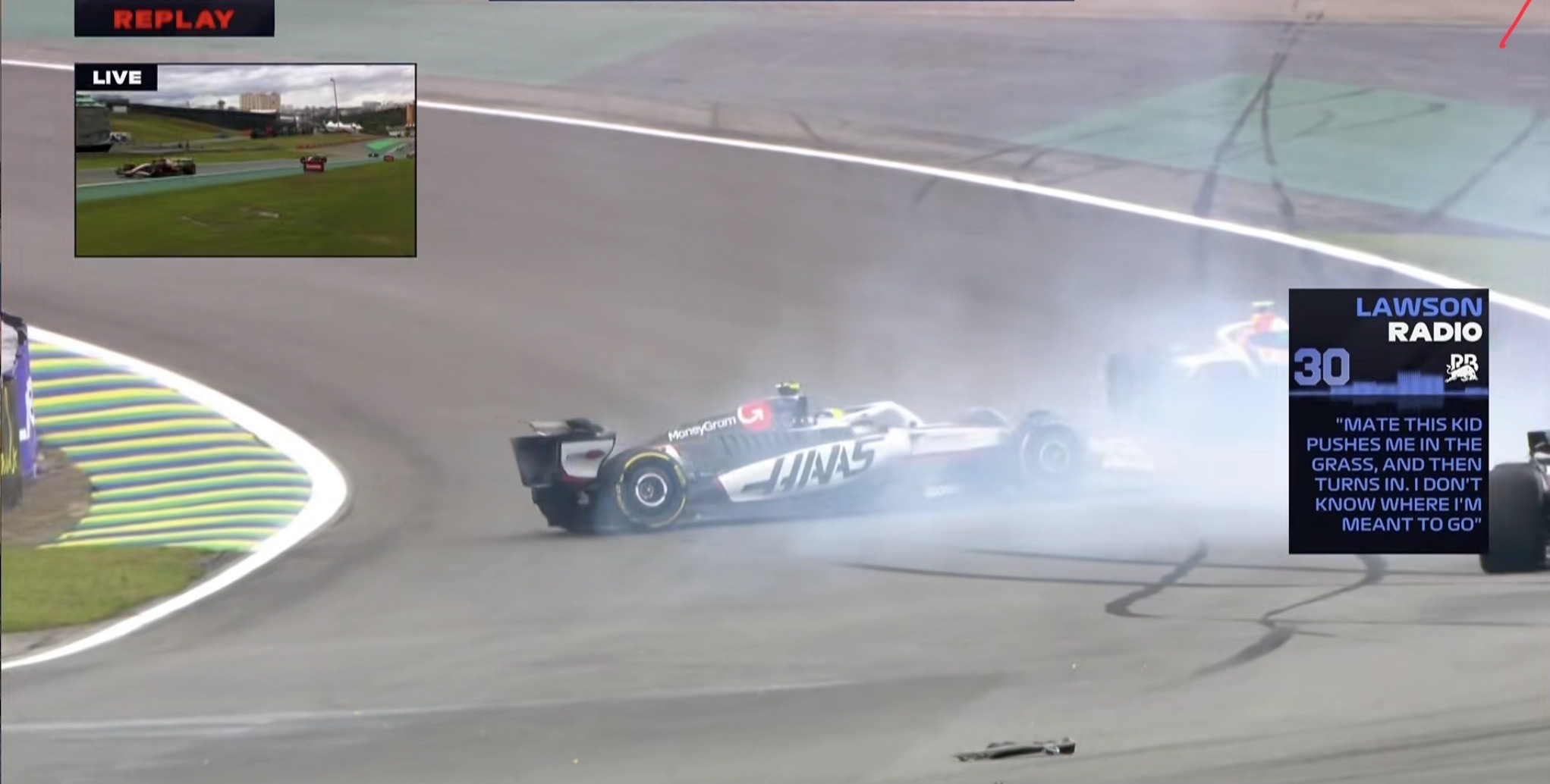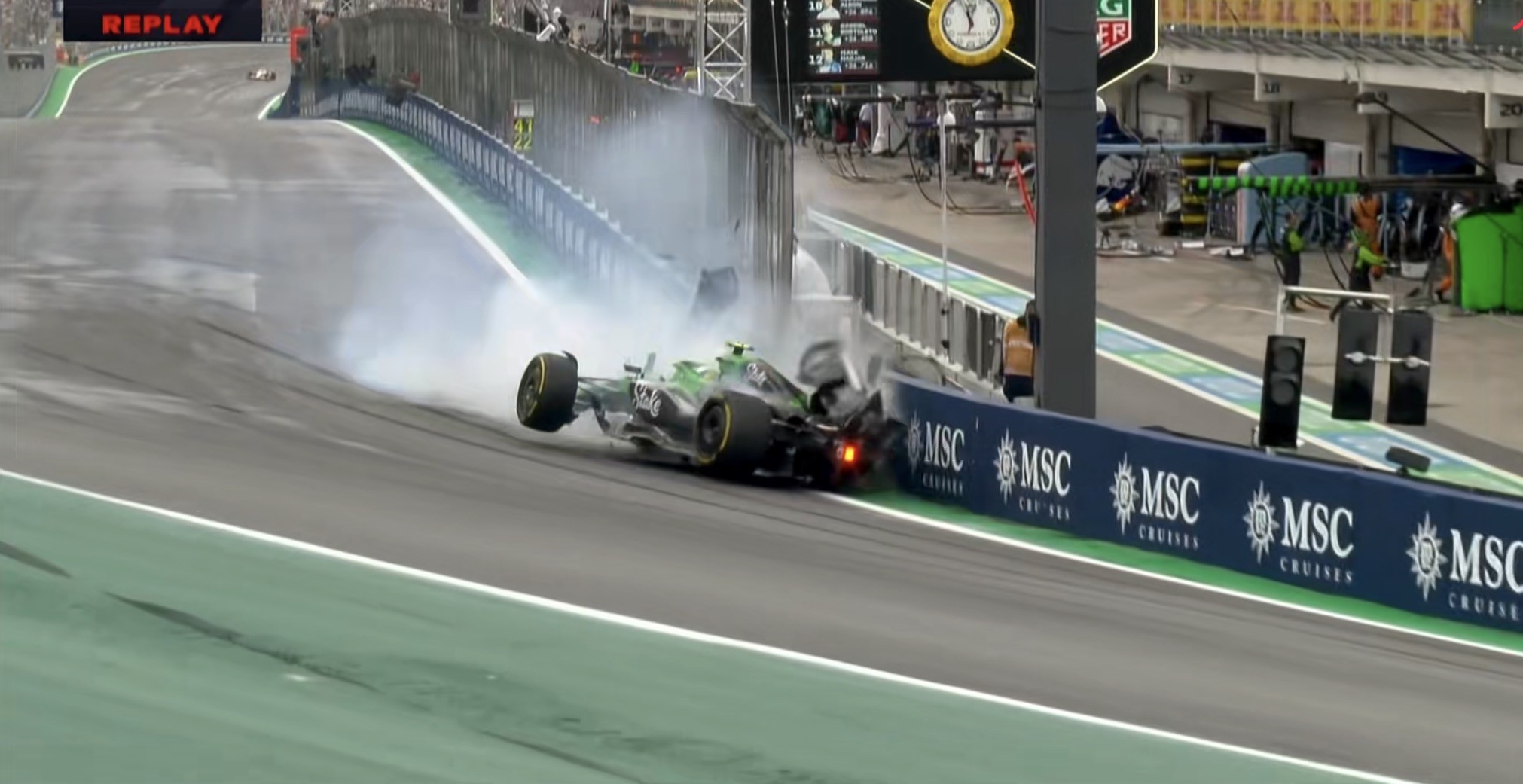 安全车出动!霍肯博格、科拉平托在同一位置发生spin,赛车上墙后受损!!!