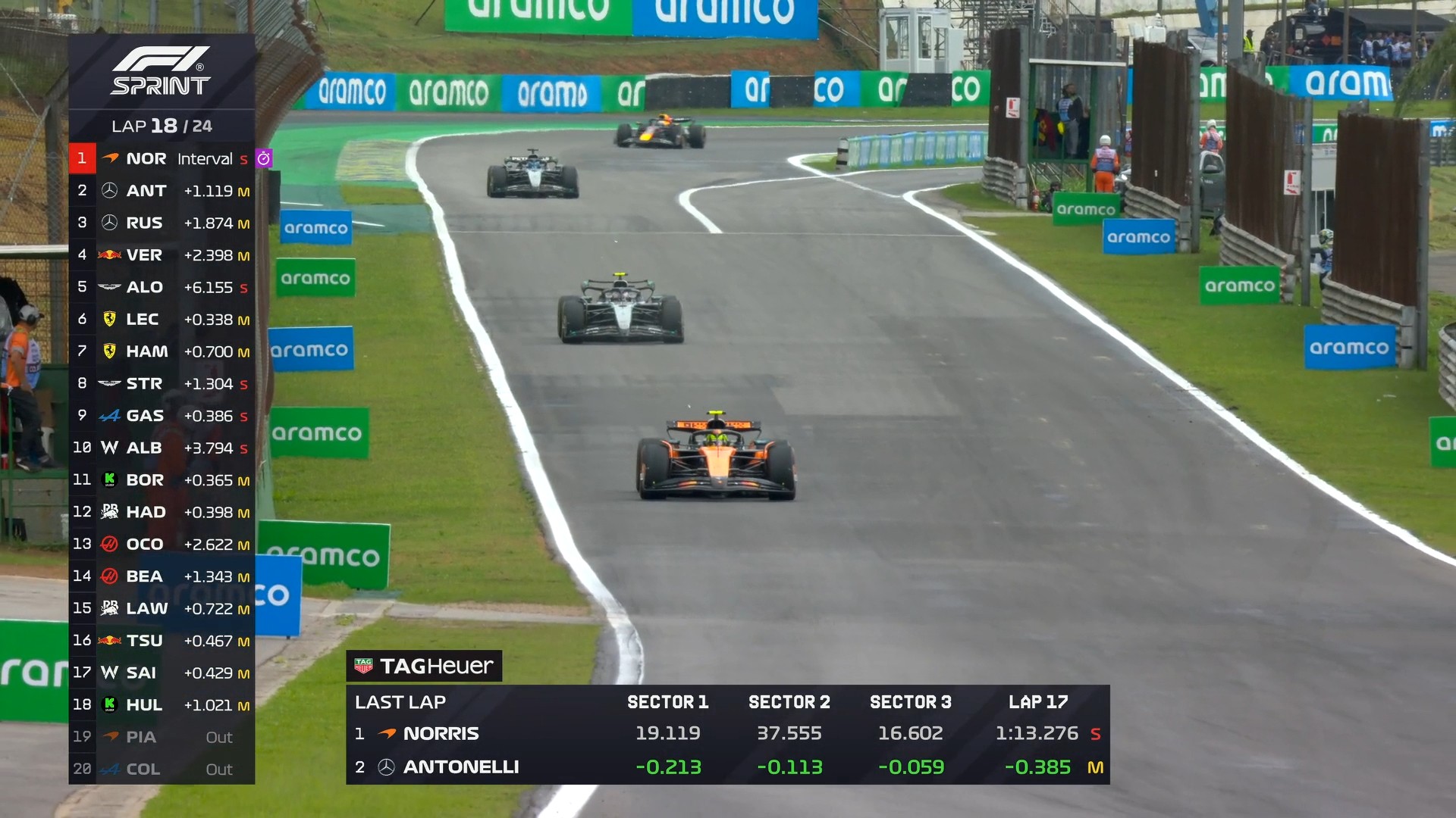 第18圈:安东内利追近领跑的诺里斯,阿隆索被维斯塔潘带开6秒,斯特罗尔也掉出了DRS区间;