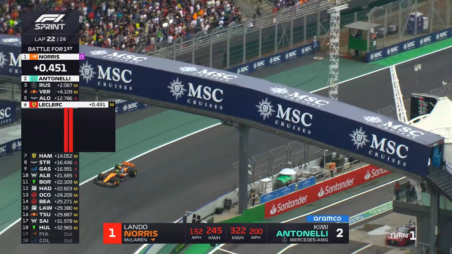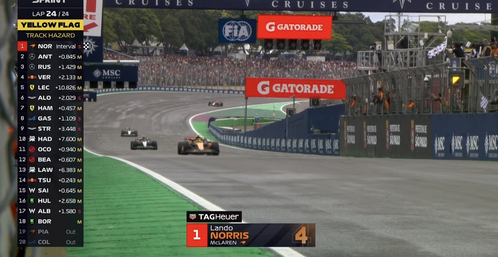 冲线!诺里斯在冲刺赛完成pole to win,与队友在积分榜上的差距扩大至9分!