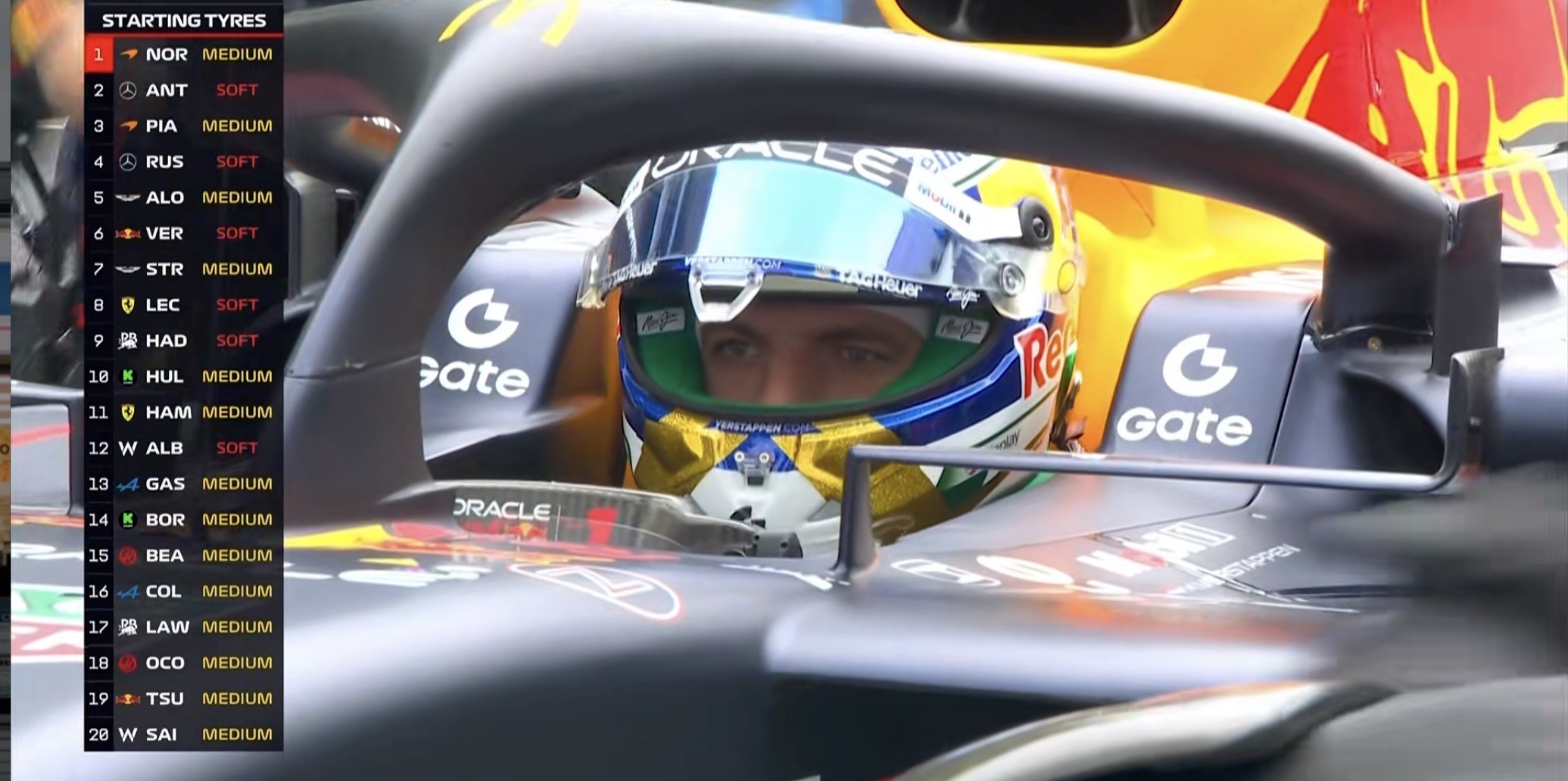 起步轮胎方面:所有车手均选择干胎,两台梅赛德斯、维斯塔潘、哈贾尔、勒克莱尔、阿尔本软胎起步,其余车手均选择中性胎;