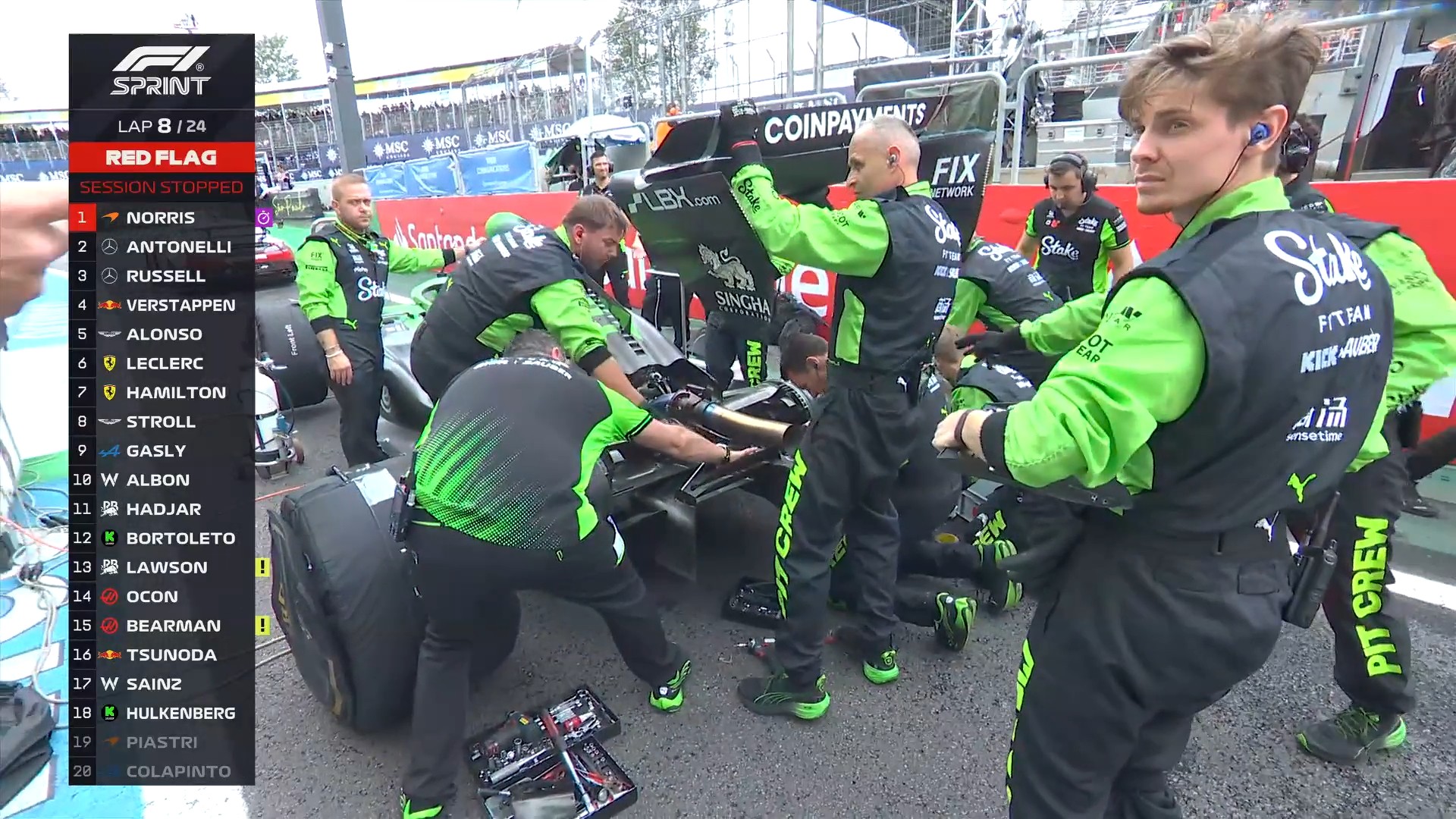 红旗期间,索伯车队为霍肯博格维修尾翼,FIA官员在一旁监督;