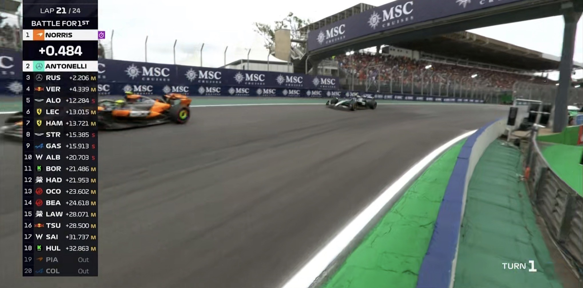 第21圈:诺里斯的软胎开始挣扎,安东内利追近至诺里斯身后0.48秒;