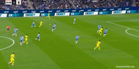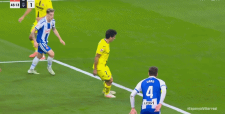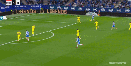 第43分钟,莫雷诺禁区前突然转身射门得分,比利亚雷亚尔1-0西班牙人