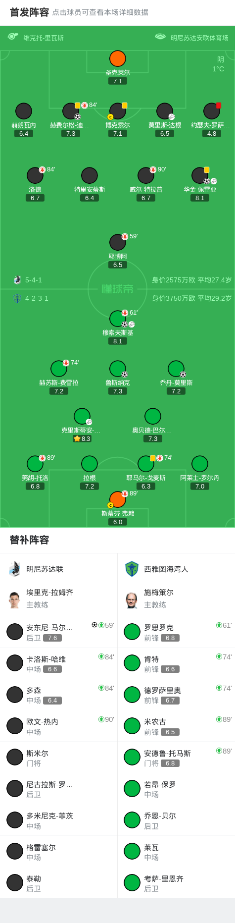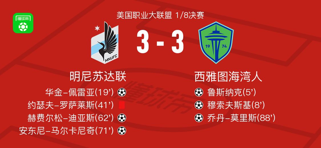 北京时间11月9日美国职业大联盟 1/8决赛,明尼苏达联主场对阵西雅图海湾人。明尼苏达联华金-佩雷亚破门,赫费尔松-迪亚斯破门,安东尼-马尔卡尼奇破门。西雅图海湾人鲁斯纳克破门,穆索夫斯基破门,乔丹-莫里斯破门。最终比分明尼苏达联 3–3 西雅图海湾人。