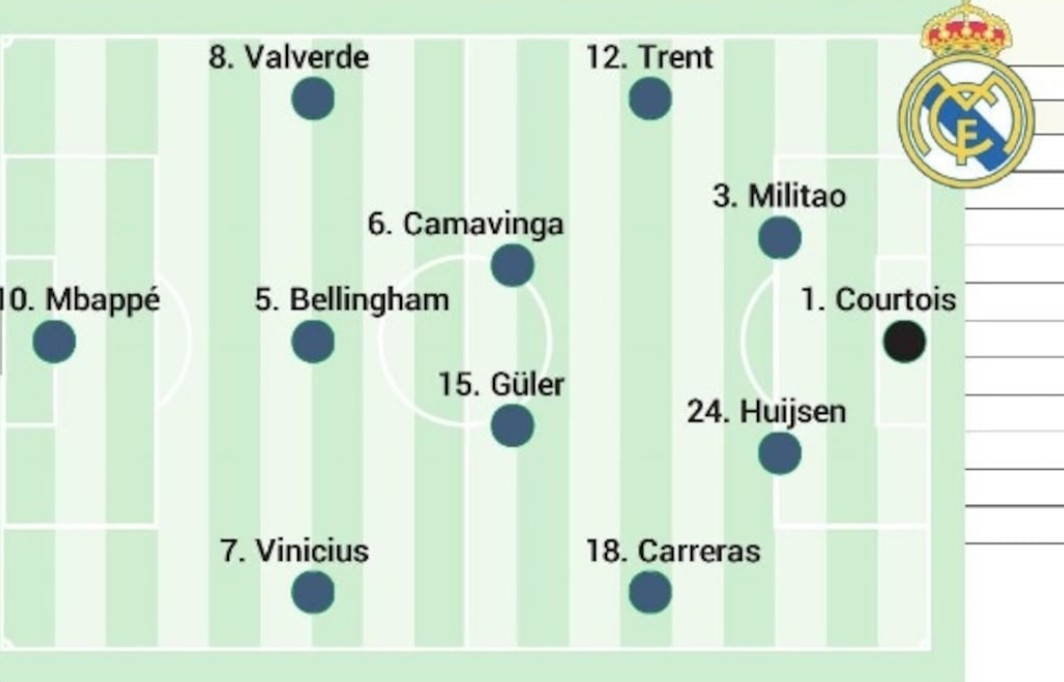 库尔图瓦;亚历山大-阿诺德、米利唐、赫伊森、阿尔瓦罗-卡雷拉斯;卡马文加、居莱尔;巴尔韦德、贝林厄姆、维尼修斯;姆巴佩
