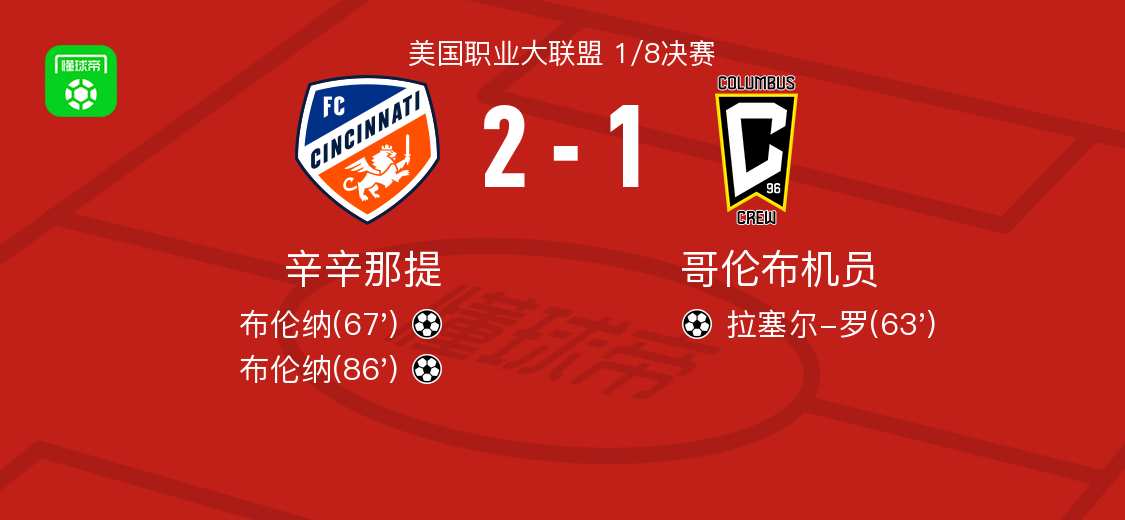 北京时间11月9日,美国职业足球大联盟季后赛1/8决赛展开较量,辛辛那提坐镇主场迎战哥伦布机员。比赛中,哥伦布机员率先打破僵局,马塞洛-埃雷拉送出助攻,拉塞尔-罗推射破门。此后辛辛那提展开反击,哈德贝精准传球助布伦纳扳平比分。比赛进入尾声阶段,吉迪送出关键助攻,布伦纳再度建功完成破门。最终,辛辛那提以2比1逆转战胜哥伦布机员,成功晋级下一轮。