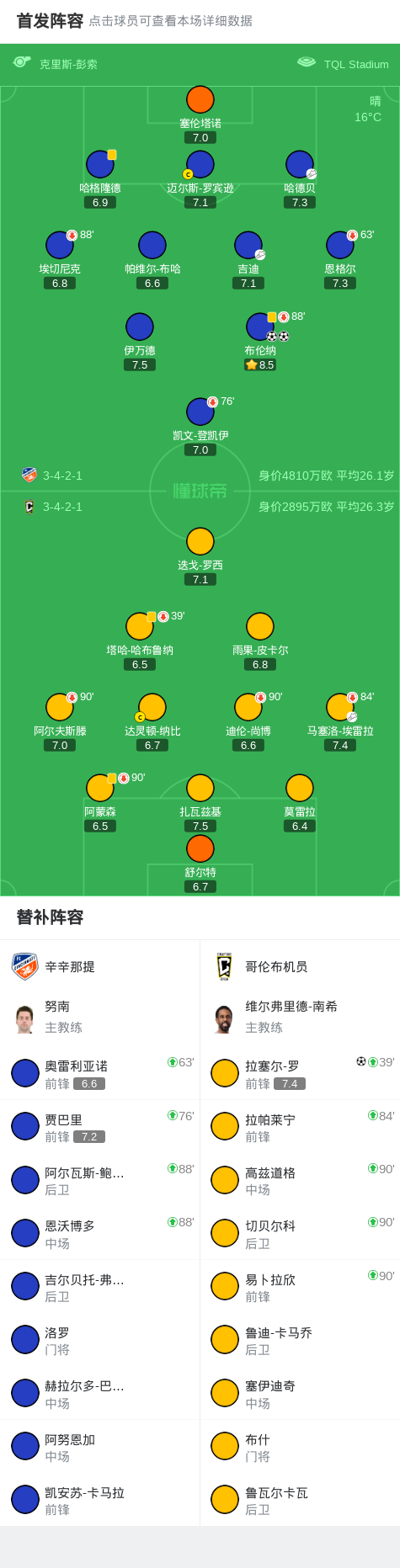 第67分钟,辛辛那提球员哈德贝助攻布伦纳打入一球。