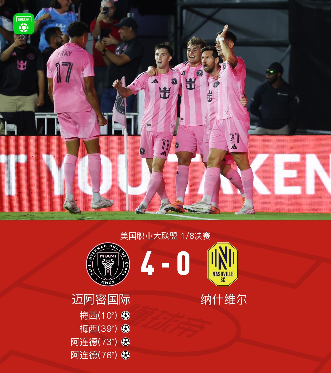 北京时间11月9日,美国职业大联盟季后赛1/8决赛展开较量(三局两胜制,本场为第三局),迈阿密国际坐镇主场迎战纳什维尔。上半场,阿连德助攻,梅西接球后冷静施射破门,为球队取得领先。随后,西尔维蒂回传弧顶,梅西跟上推射破门完成梅开二度,进一步扩大比分优势。下半场,阿尔巴助攻阿连德破门再进一城。随后,梅西助攻阿连德破门完成双响,同时梅西也完成了生涯第400次助攻。最终,迈阿密国际4-0纳什维尔,总比分2-1晋级八强。