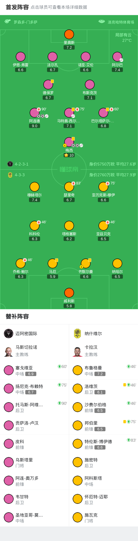 第73分钟,阿尔巴底线低传门前,阿连德推射破门,迈阿密3-0