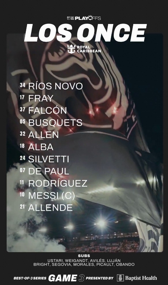 北京时间11月9日9点,美职联1/8决赛(第三回合),迈阿密国际对阵纳什维尔,赛前公布首发名单。