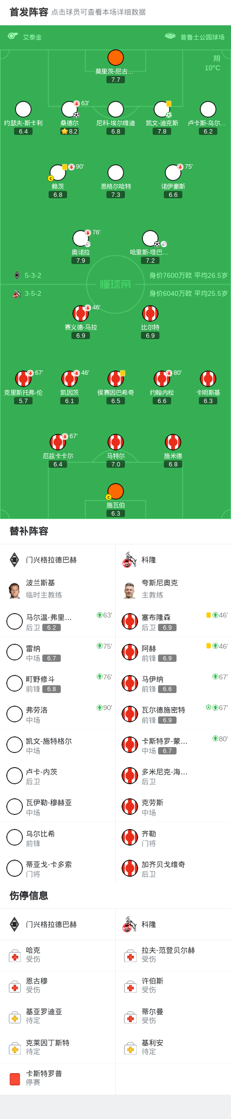 第64分钟,门兴格拉德巴赫球员奥诺拉助攻哈里斯-塔巴科维奇打入一球。