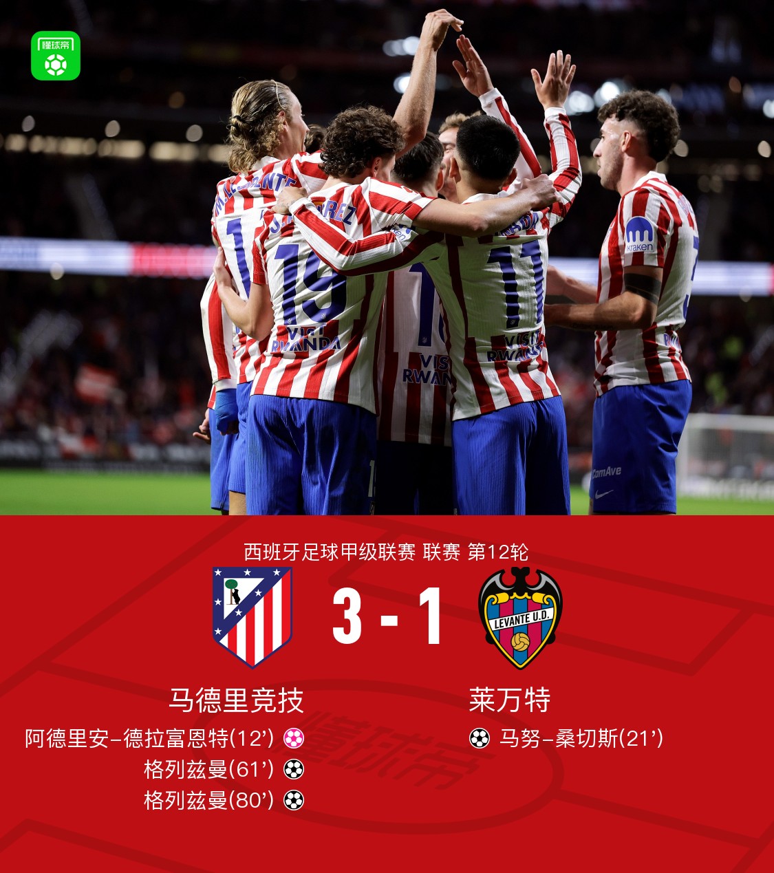 第80分钟,阿尔瓦雷斯射门被扑,格列兹曼补射破门完成双响,马竞3-1莱万特