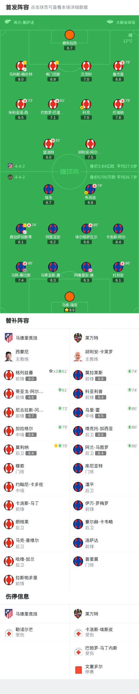 第61分钟,略伦特传中,格列兹曼上场即破门,马竞2-1莱万特