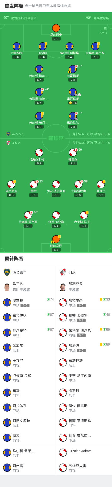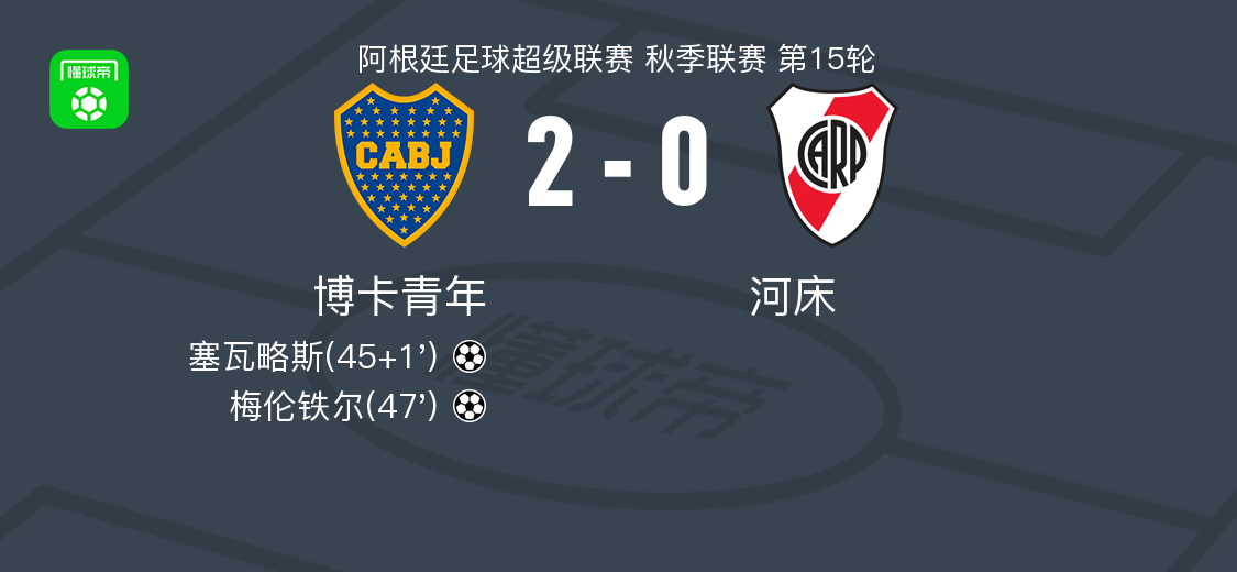 第47分钟,博卡青年球员塞瓦略斯助攻梅伦铁尔打入一球。