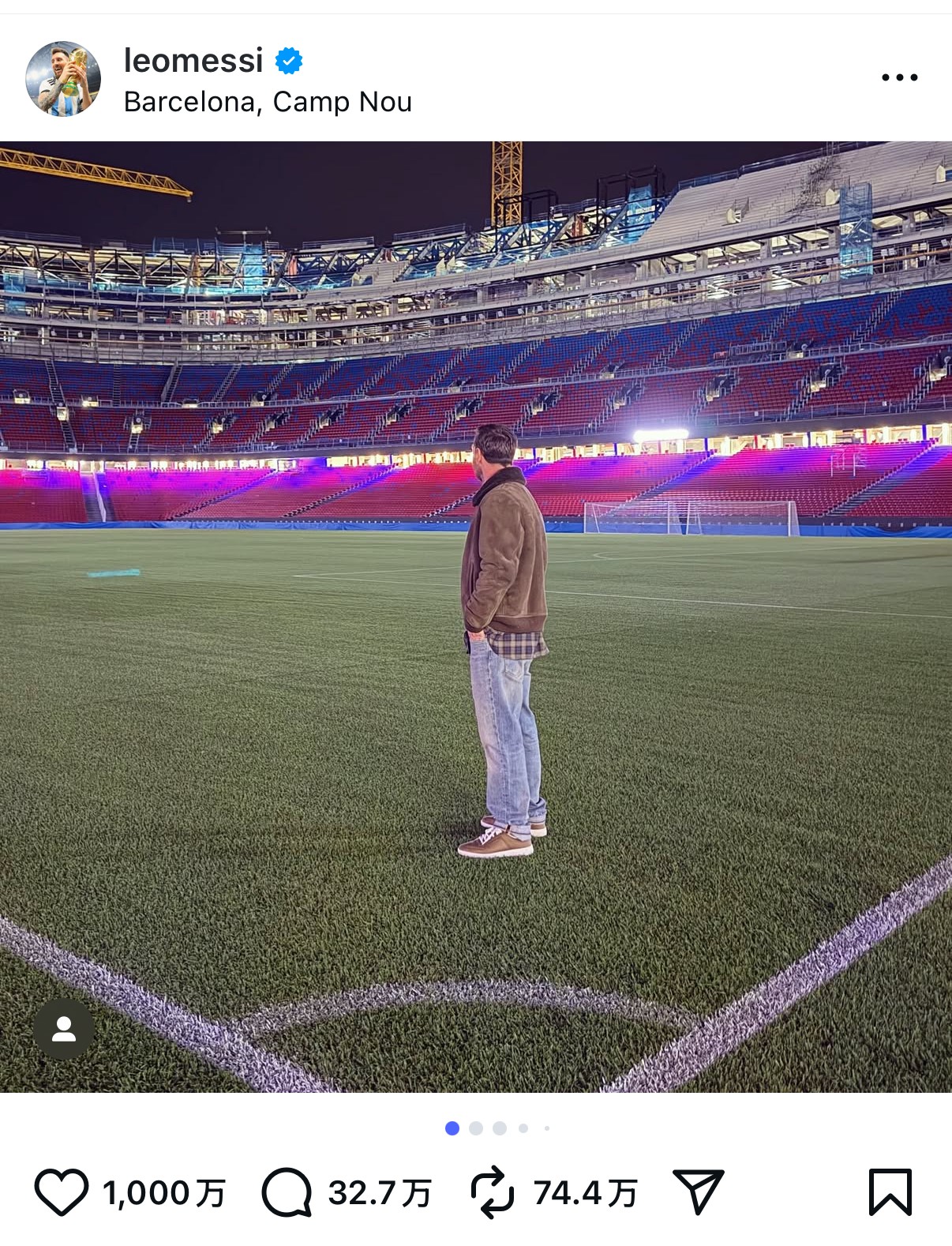 11月10日,梅西在社交媒体晒出他深夜造访诺坎普球场的照片,在发布仅四个小时后,这则动态的点赞量已突破1000万。