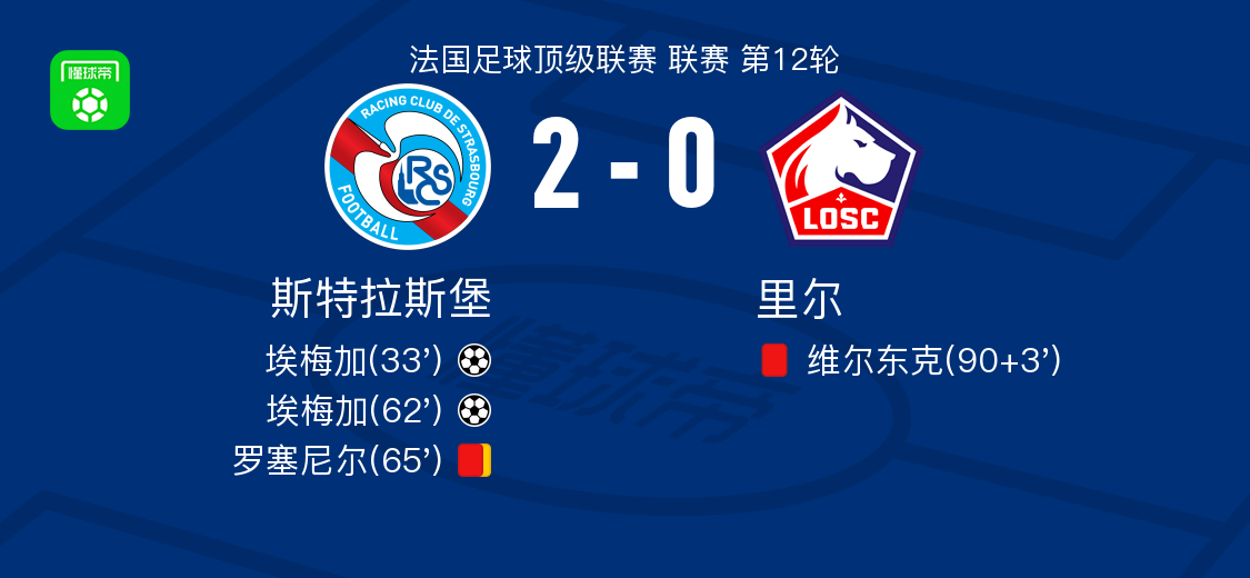 北京时间11月10日,法国足球甲级联赛第12轮展开较量,斯特拉斯堡坐镇主场迎战里尔。比赛中,斯特拉斯堡球员埃梅加表现出色,接队友迭戈-莫雷拉精准传球后率先打破僵局。此后,埃梅加再度发力,成功攻入第二粒进球,帮助球队扩大领先优势。比赛进入尾声阶段,斯特拉斯堡球员罗塞尼尔因累计两张黄牌被罚离场。补时阶段,里尔球员维尔东克领到红牌,无缘继续参与比赛。最终,斯特拉斯堡以2比0战胜里尔,全取三分。