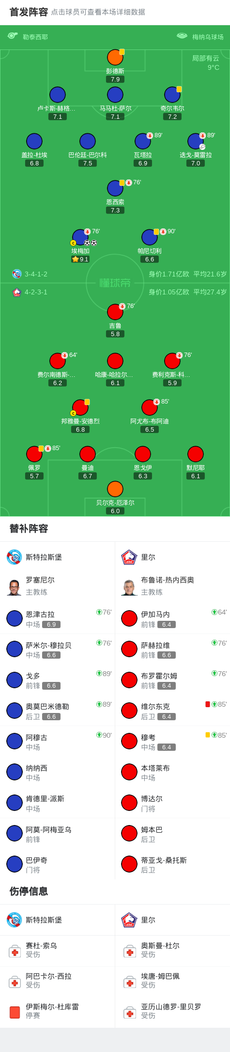 下半场补时第3分钟,里尔球队维尔东克吃到红牌。