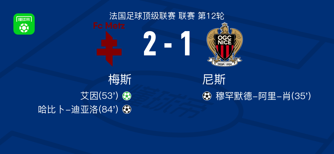 北京时间11月10日,法国足球甲级联赛第12轮展开较量,梅斯坐镇主场迎战尼斯。比赛中,尼斯率先打破僵局,瓦努特送出助攻,穆罕默德-阿里-肖成功破门。随后,梅斯由艾因通过点球还以颜色,将比分扳平。比赛进入尾声阶段,格巴明助攻哈比卜-迪亚洛完成进球,帮助梅斯实现反超。最终,梅斯以2比1战胜尼斯,全取三分。
