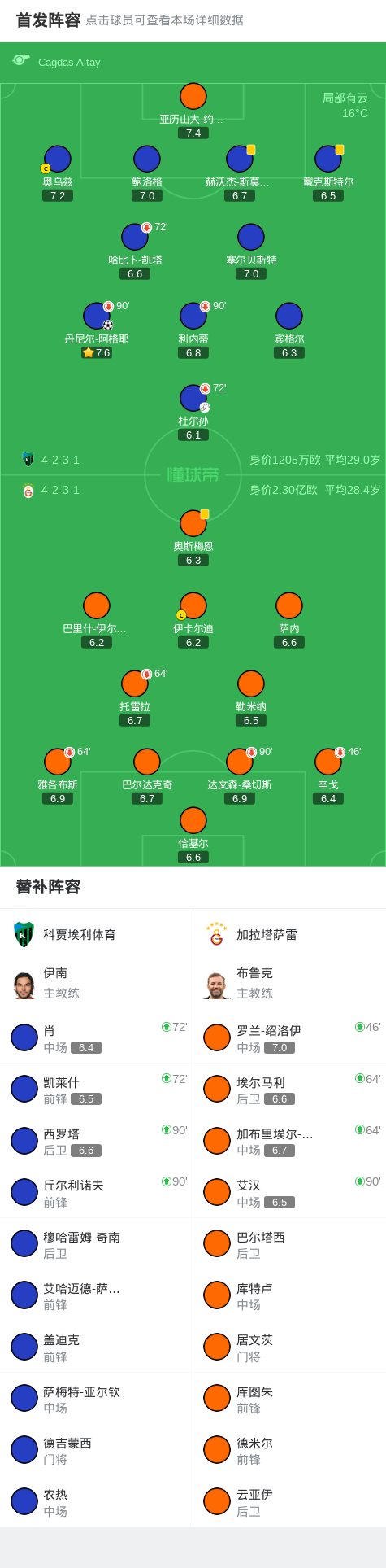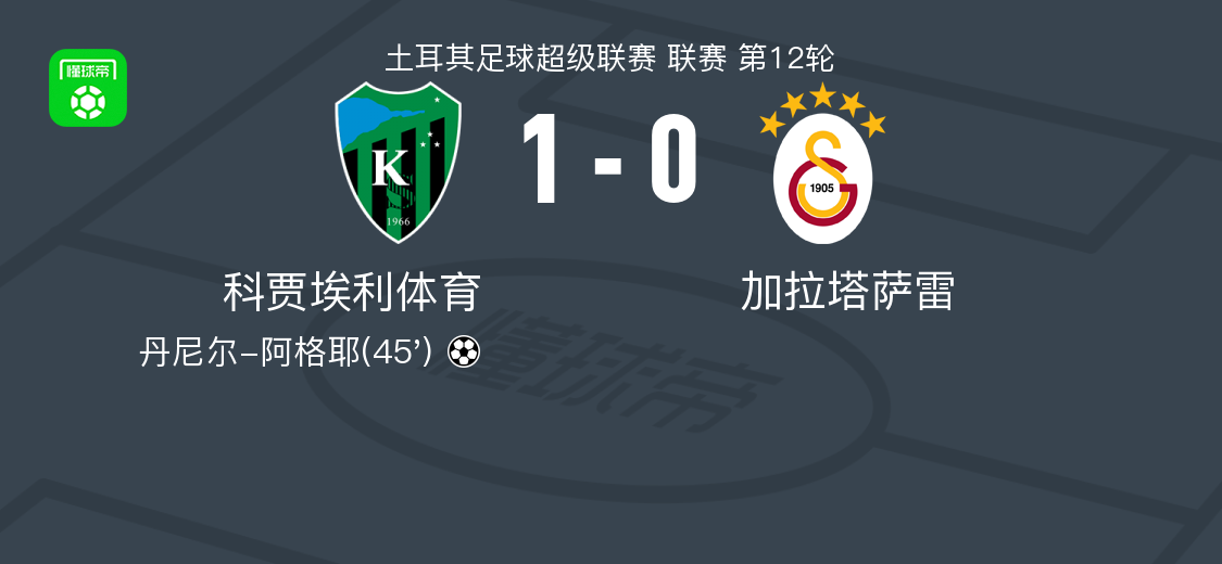 北京时间11月9日土耳其足球超级联赛 联赛 第12轮,科贾埃利体育主场对阵加拉塔萨雷。科贾埃利体育丹尼尔-阿格耶破门。最终比分科贾埃利体育 1–0 加拉塔萨雷。