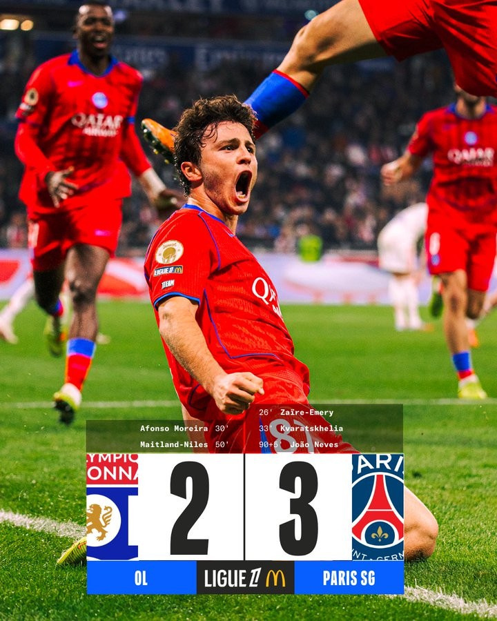 北京时间11月10日,在法甲第12轮的比赛中,巴黎圣日耳曼依靠若昂-内维斯的补时绝杀客场3-2击败里昂,继续以2分优势排名法甲积分榜首位。