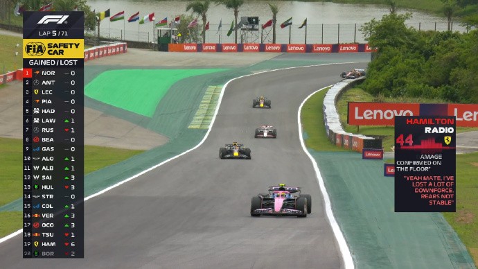 安全车结束后,皮亚斯特里、安东内利、勒克莱尔三车并排,皮亚斯特里碰到安东内利,后者碰到勒克莱尔左前轮,勒克莱尔退赛!