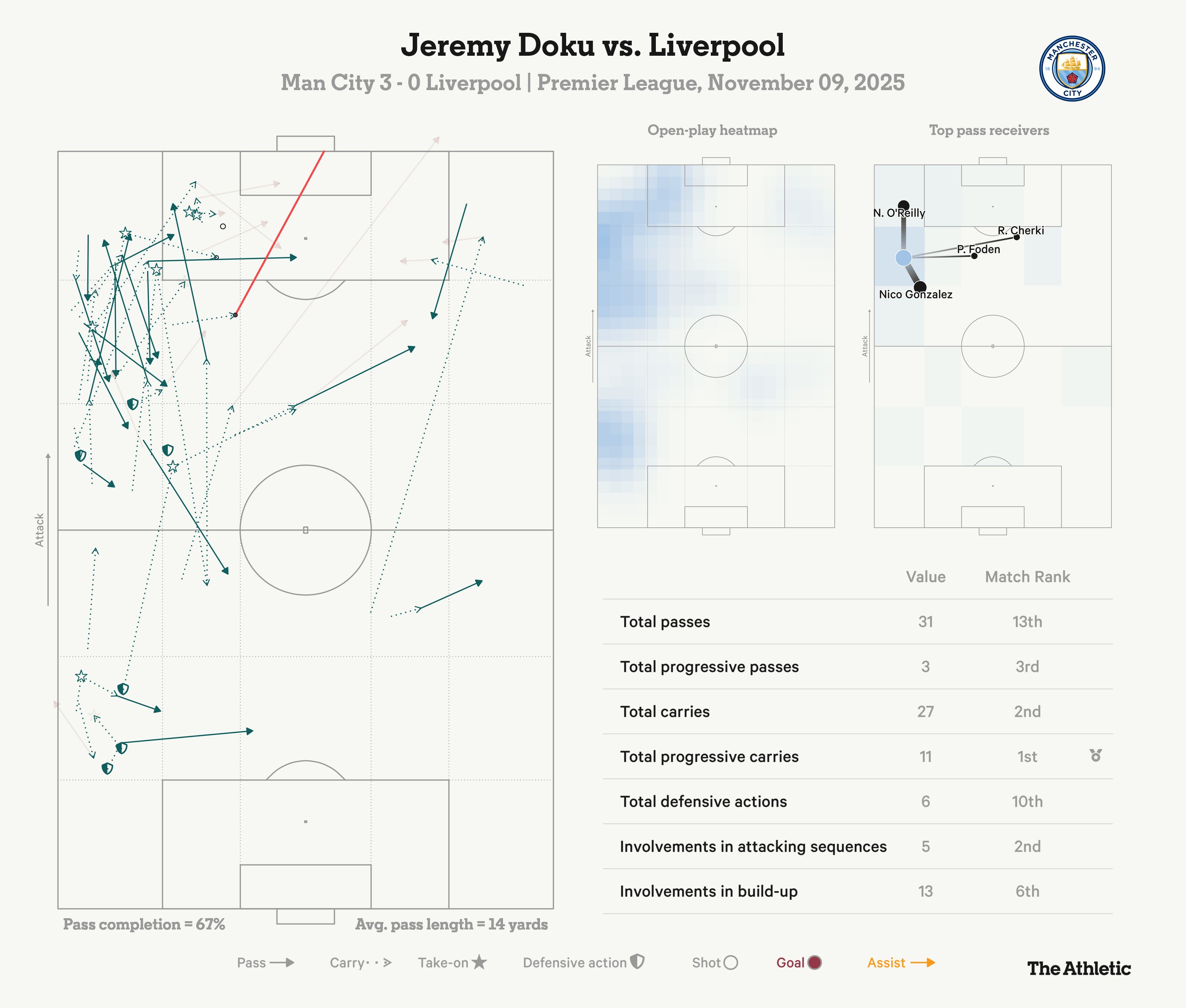 北京时间11月10日,英超第11轮,曼城3-0战胜了利物浦,赛后,The Athletic发表专题文章,分析并点评了本场比赛,以下为专题文章。