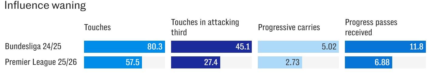 维尔茨的场均触球数从上赛季的80次暴跌至本赛季英超的58次。在进攻区域,这一下降甚至更为明显:他在英超场均最终三区触球27次,而去年在德国时是场均45次。