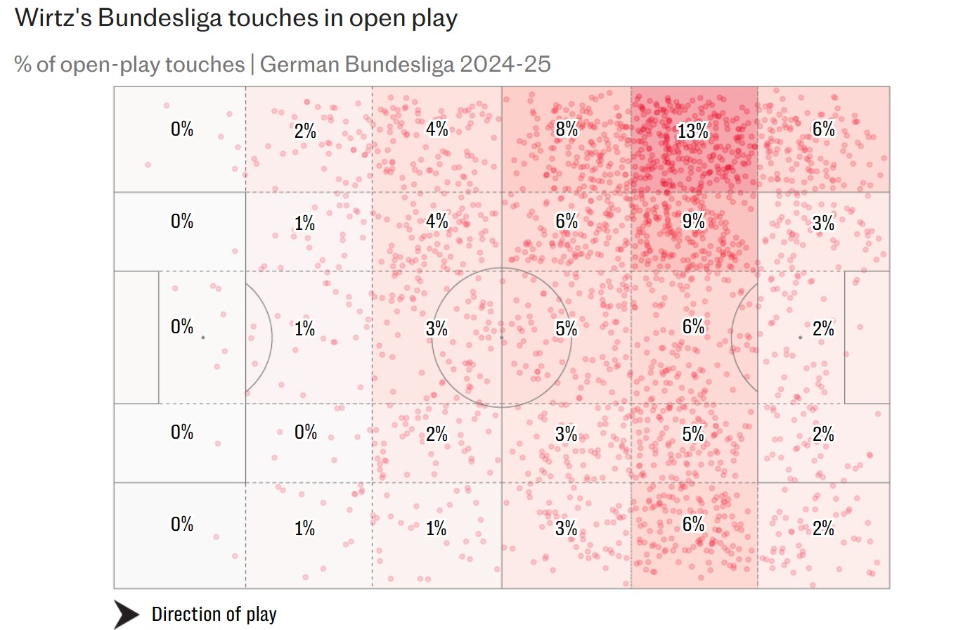 维尔茨被签下是作为利物浦的10号位球员,但上赛季他在勒沃库森的大部分触球发生在左翼(当时他主要司职3-4-2-1阵型中的左路攻击型中场)。上赛季在德甲,他45%的触球发生在左路进攻区域。而本赛季在利物浦,这一比例仅为25%。总体而言,他在利物浦在右路的触球比例(27%)实际上更高。