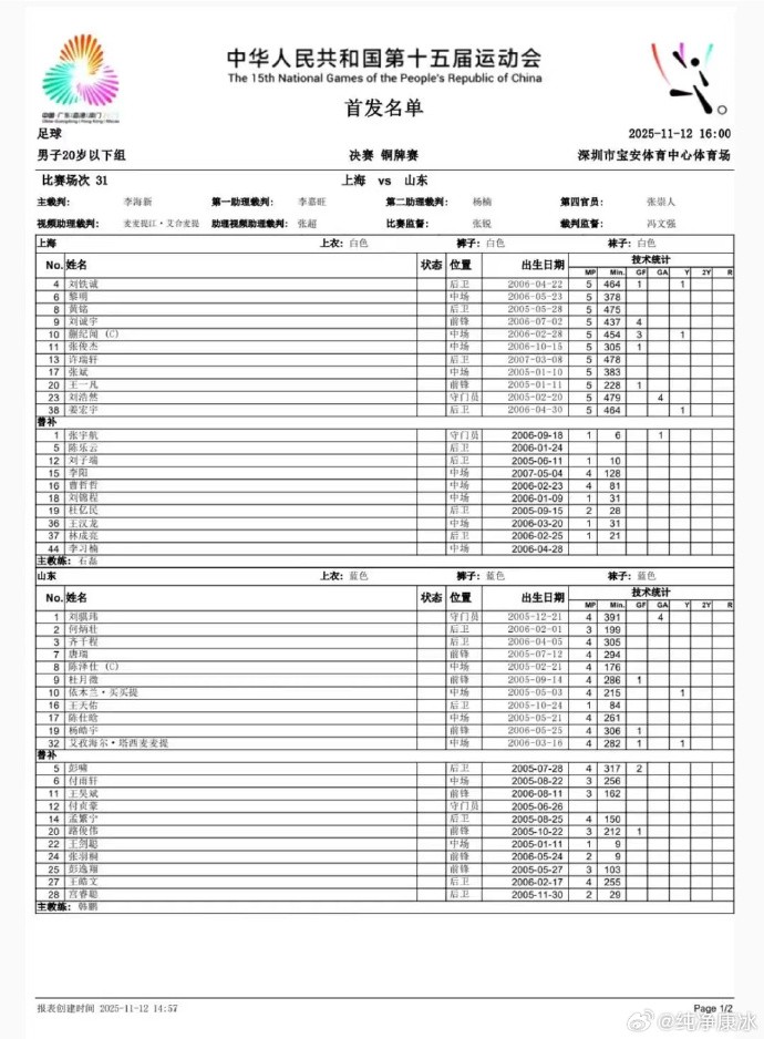 北京时间11月12日,全运会U20男足三四名决赛,上海U20对阵山东U20。受伤的彭啸进入替补席。