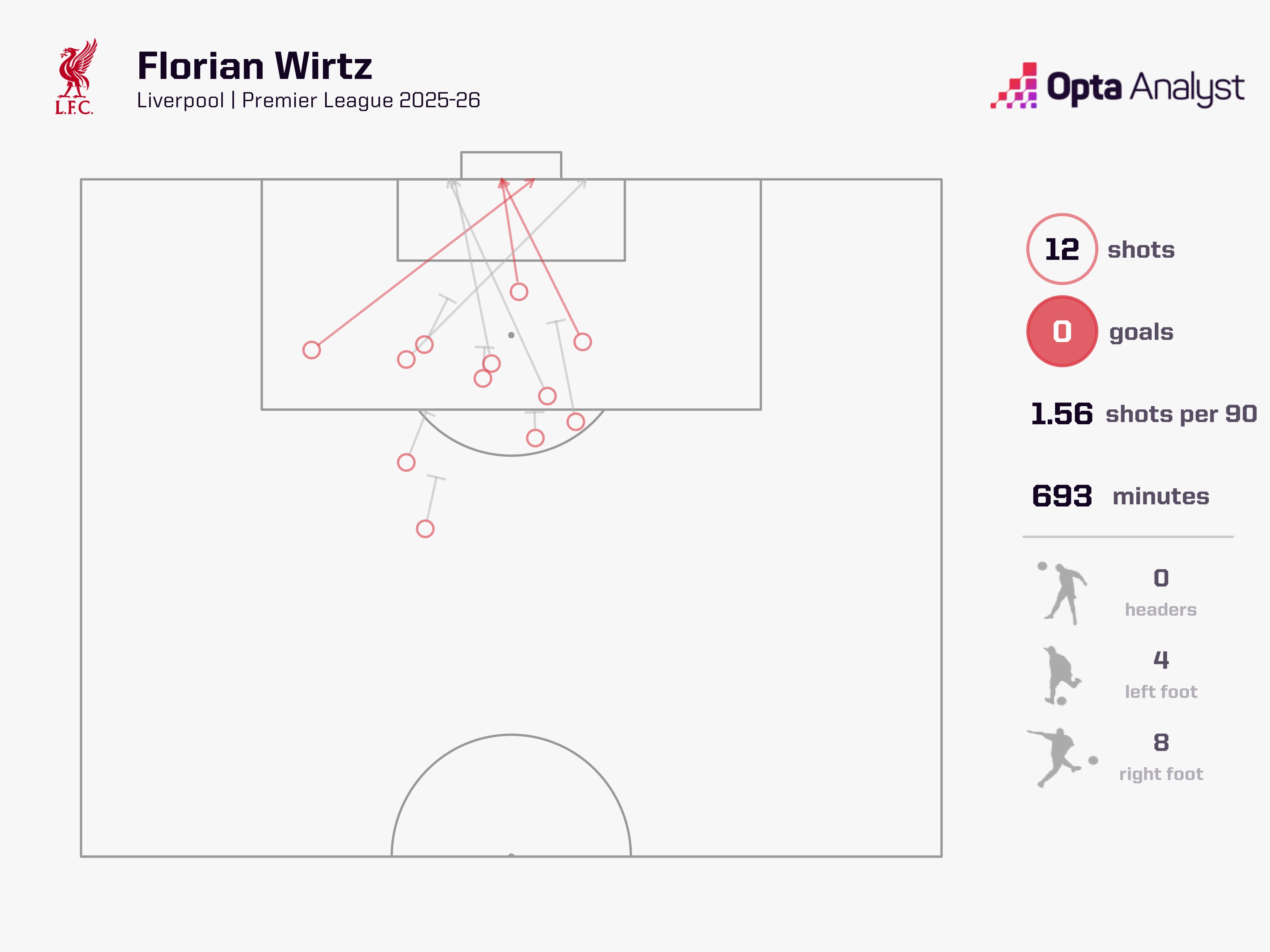 考虑各项赛事,维尔茨已经为利物浦出场16次,未斩获进球,有3次助攻入账。