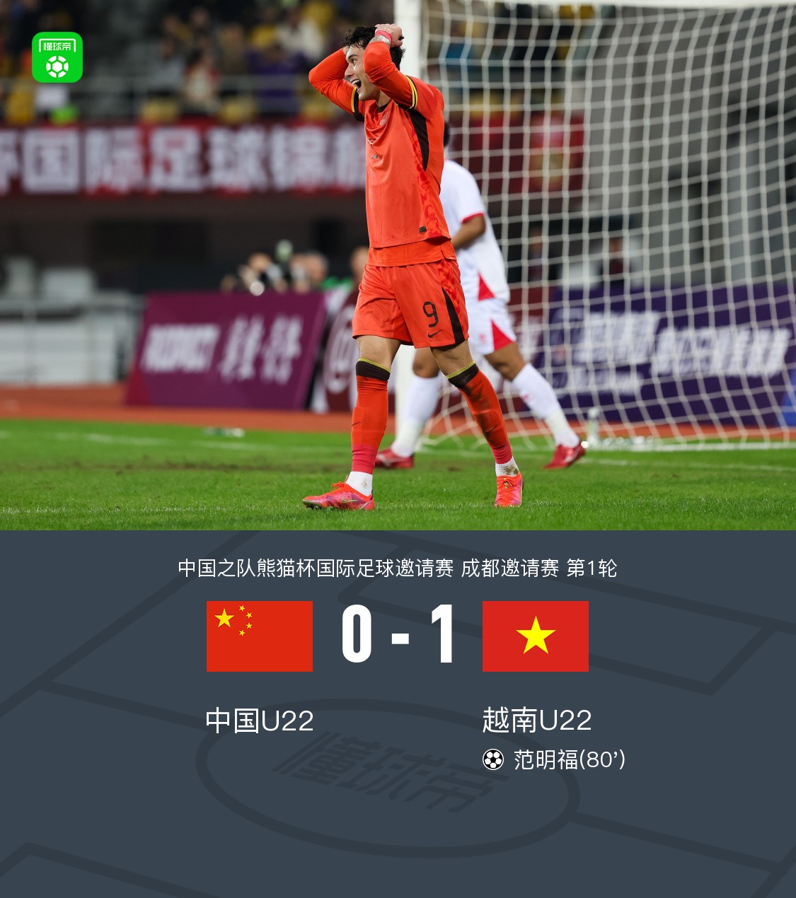 北京时间11月12日,中国之队熊猫杯国际足球邀请赛成都邀请赛首轮展开较量,中国U22与越南U22展开对决。比赛中,越南U22球员范明福攻入全场唯一进球。最终,越南U22以1-0战胜中国U22,取得赛事开门红。